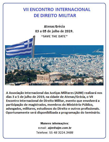 A Associação Internacional das Justiças Militares (AIJM) promoverá o VII Encontro Internacional de Direito Militar, nos dias 3 a 5 de julho de 2019, na cidade de Atenas/Grécias.