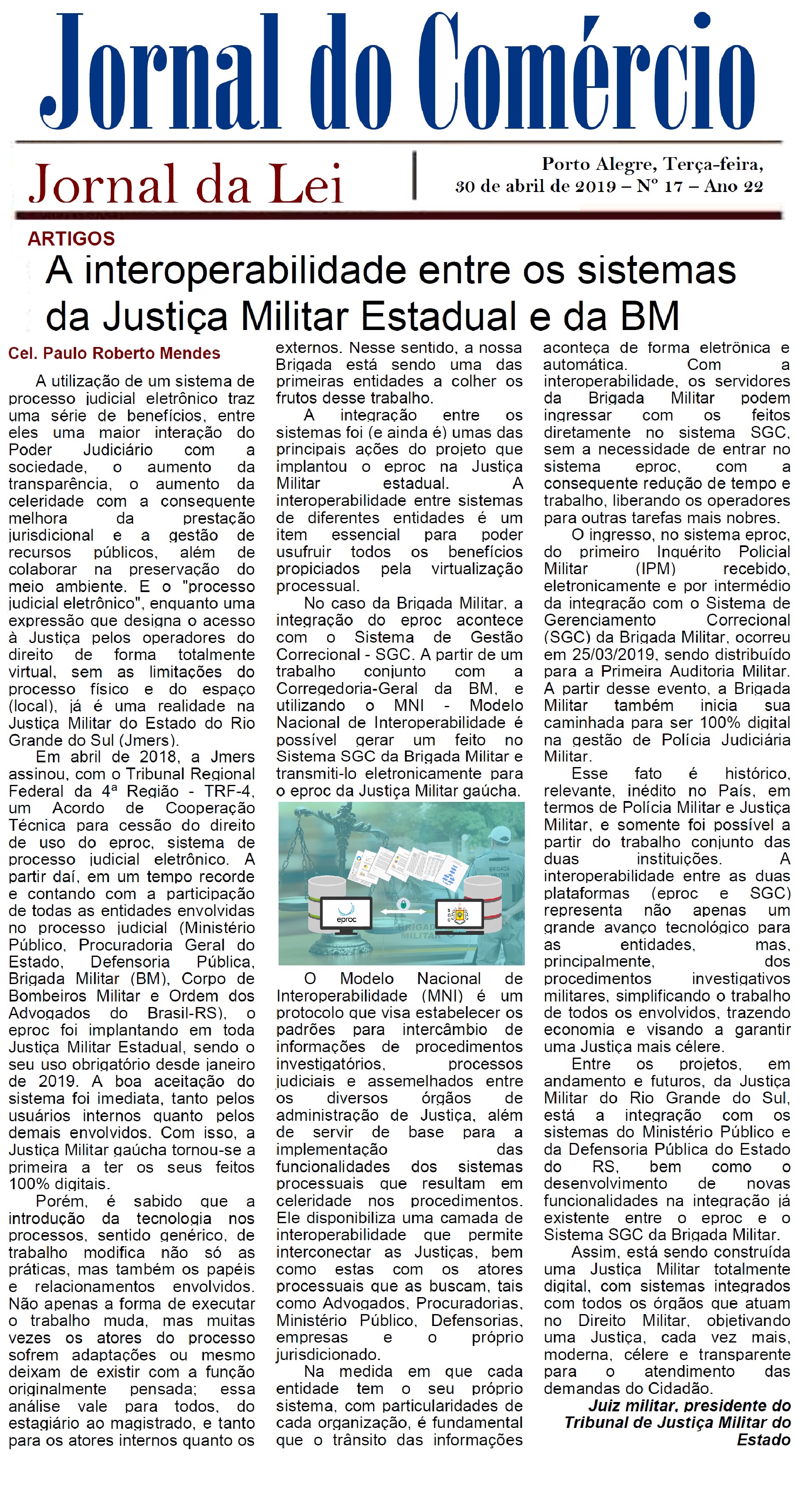 Artigo Jornal do Comércio: A interoperabilidade entre os sistemas da JME e da Brigada Militar