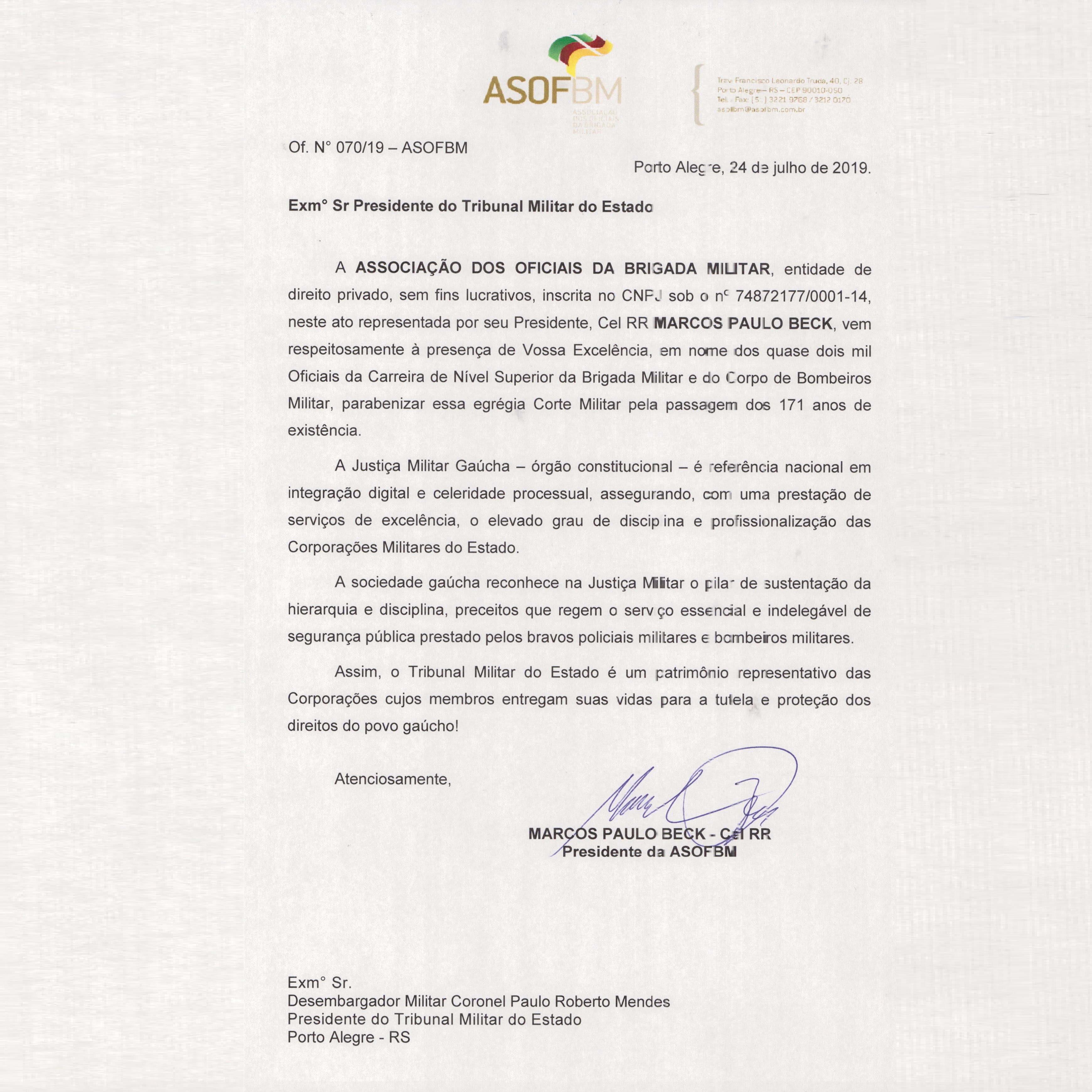 AsofBM parabeniza a Justiça Militar pela passagem dos 171 anos de existência
