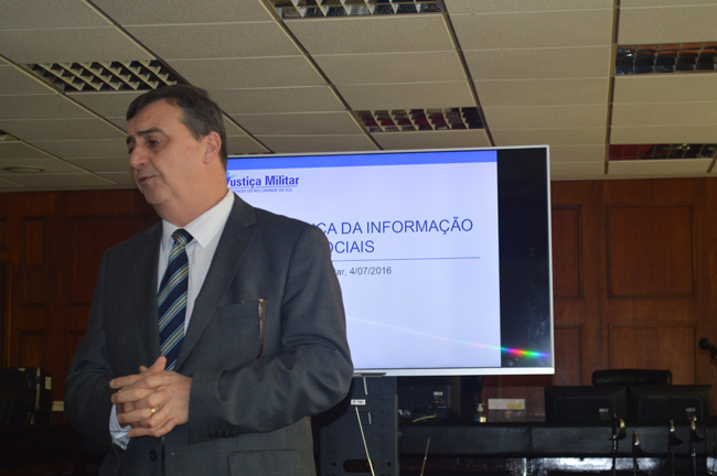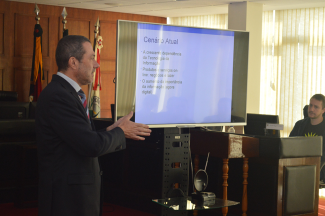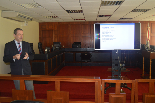 Nesta segunda-feira (4 de julho) a Comissão de Segurança da JME/RS realizou reunião com magistrados, direção geral, secretários de juiz, coordenadores de setor e outros servidores de áreas estratégicas do Tribunal e das Auditorias, para abordar a questão da segurança da informação no âmbito da Instituição. O Presidente da Comissão e também Juiz-Vice-Presidente da Corte Fábio Duarte Fernandes, o Assistente Militar Sergio Portela e o Diretor Geral Dirnei Vieira de Vieira operacionalizaram o evento, enquanto o Coordenador de TIC Dilnei Venturini apresentou e detalhou um programa básico de estruturação, normatização e atitudes de segurança em relação à utilização dos meios disponíveis.