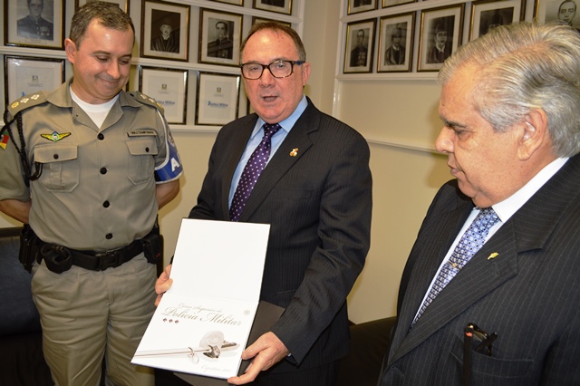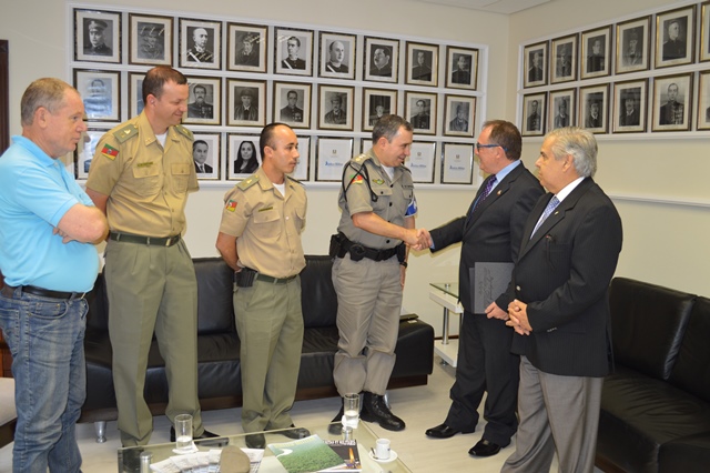 Na tarde desta terça-feira (17 de novembro), membros da comissão de formatura do Curso Superior de Polícia Militar da BM (Capitães 2015) foram recebidos pelo Juiz-Presidente Sergio Antonio Berni de Brum, Juiz-Vice-Presidente Antonio Carlos Maciel Rodrigues e Juiz-Corregedor Geral da JME Paulo Roberto Mendes Rodrigues. O Major Luis Henrique Campomar, formandos João Cesar Verde Selva e Cristiano Martins da Silva, entregaram o convite para a solenidade que acontecerá às 20h30 do dia 20 de novembro de 2015, na Academia de Polícia Militar, em Porto Alegre.