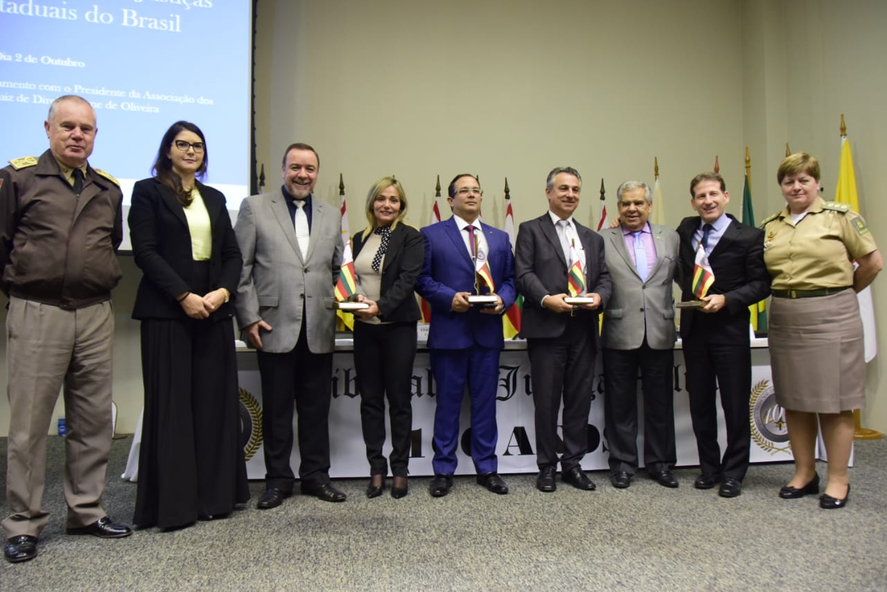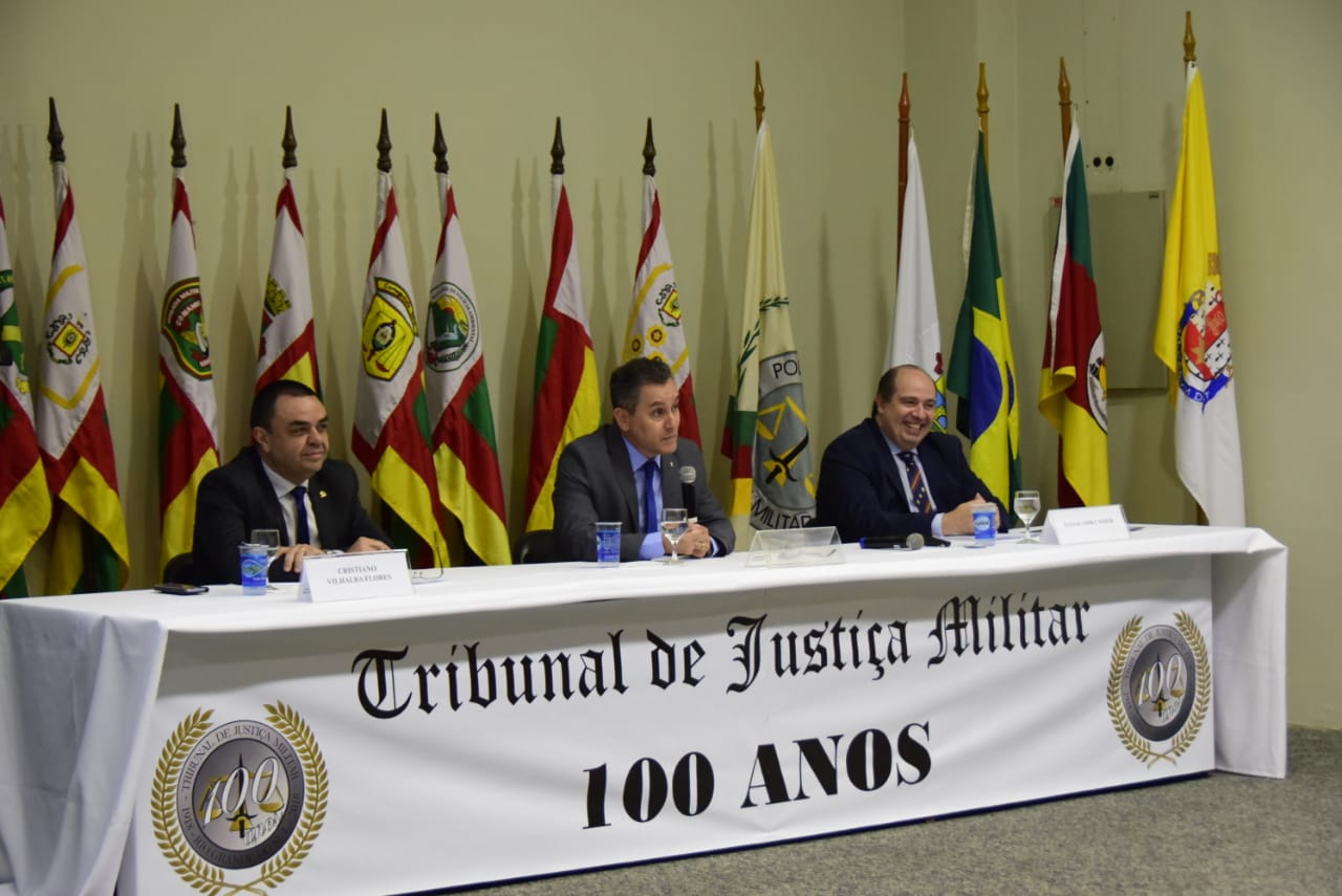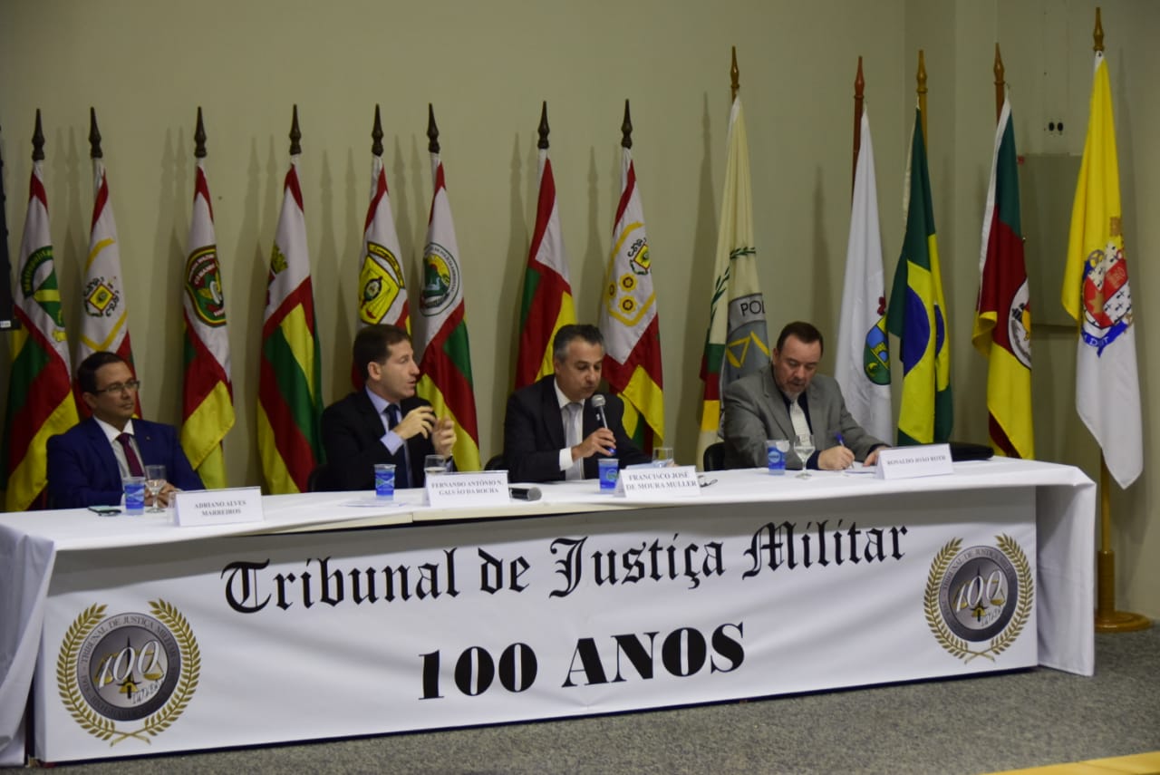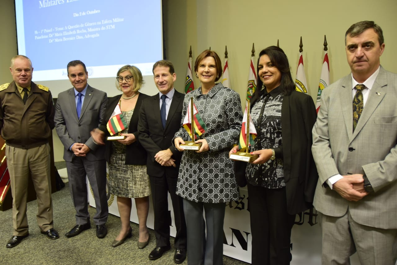 Ao final do painel, os Magistrados do Tribunal de Justiça Militar do Estado do Rio Grande do Sul, Juiz Civil Amilcar Fagundes Freitas Macedo, Corregedor-Geral, e o Juiz Militar Fábio Duarte Fernandes, acompanhados pelo Juiz do Tribunal de Justiça Militar de São Paulo Paulo Adib Casseb conferiram às painelistas e à mediadora uma homenagem.
