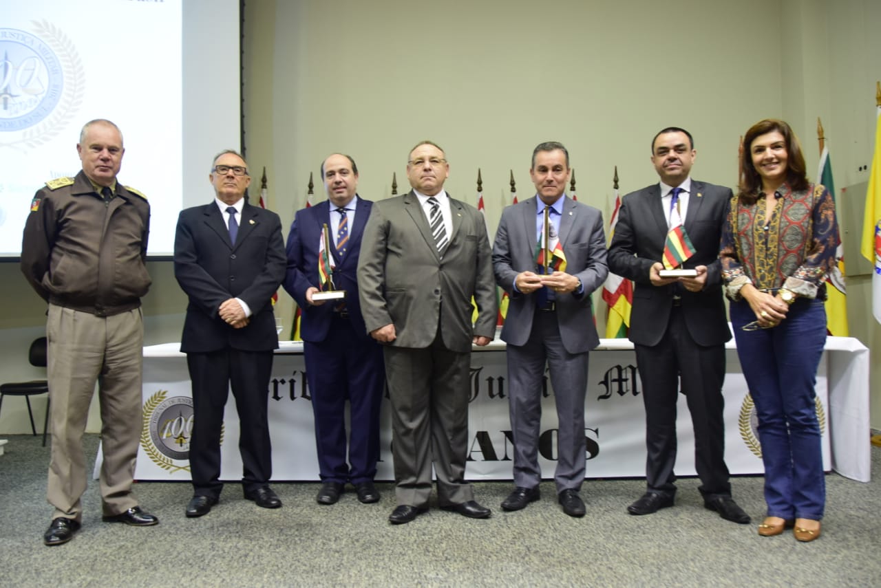 Ato seguinte, foram entregues comendas dos 100 anos do TJM/RS aos palestrantes Jayme de Oliveira e Paulo Adib Casseb.
