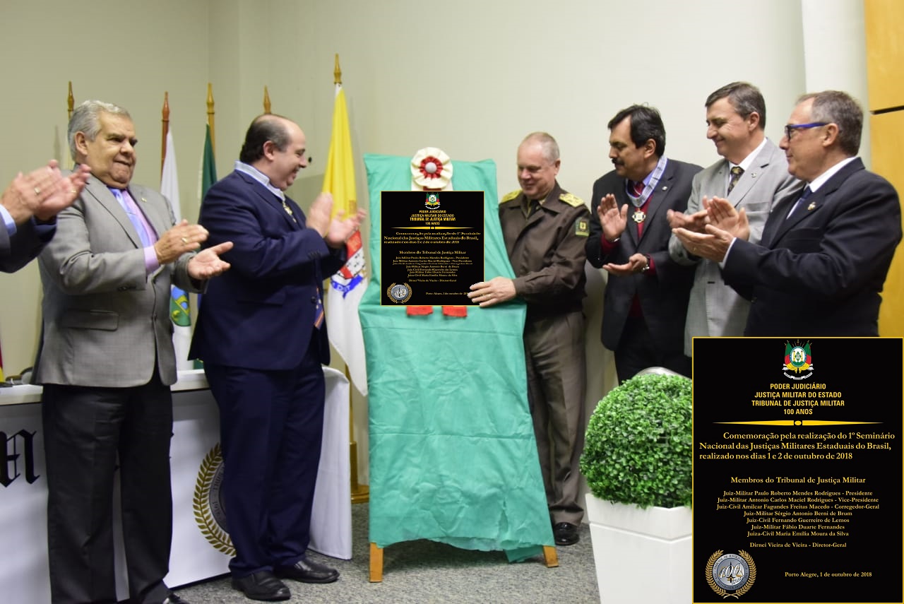 Após todas as entregas, proferiu-se o descerramento da placa alusiva ao evento, por todos os Magistrados do TJM/RS presentes e pelos Magistrados Jayme de Oliveira e Paulo Adib Casseb.