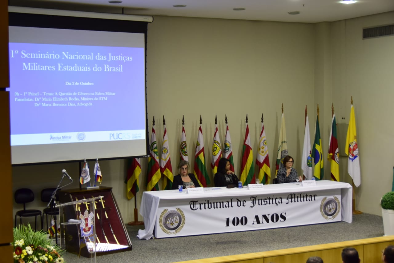 Nesse segundo dia, a partir das 8h houve o credenciamento e, às 09 horas, foi declarado aberto o seminário e apresentado o primeiro painel, que abordou o tema “A questão de gênero na esfera Militar”, tendo como painelistas, a Ministra do Superior Tribunal Militar Maria Elizabeth Rocha, e a Desembargadora Jubilada Maria Berenice Dias, e como mediadora a Professora Decana Associada da Escola de Direito da PUC/RS, Clarice Beatriz da Costa Söhngen.