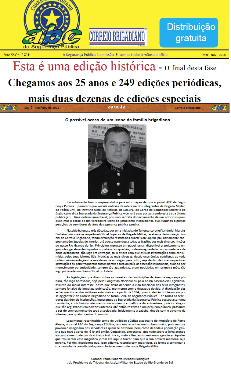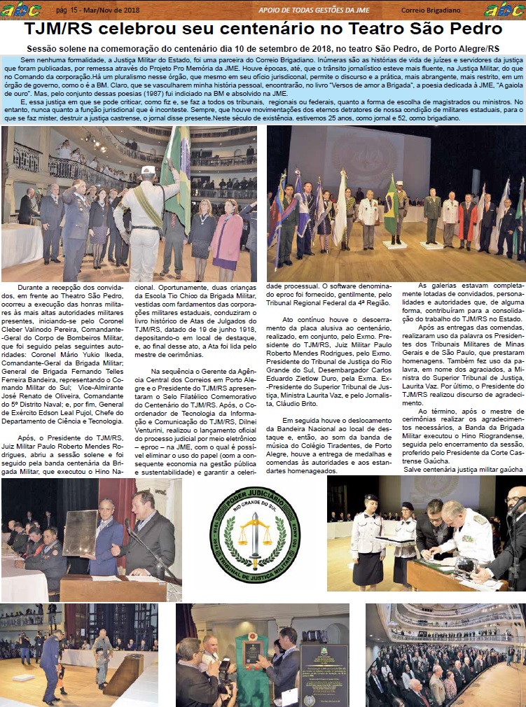 A edição histórica n.º 249 (Março/Novembro - 2018) do Correio Brigadiano - Jornal ABC da Segurança Pública, em comemoração aos seus 25 anos, publicou notícias referentes à Justiça Militar do Estado do Rio Grande do Sul.