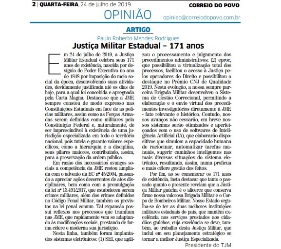 Correio do Povo - Artigo: Justiça Militar Estadual - 171 anos