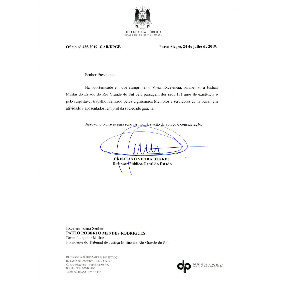 Defensoria Pública parabeniza a Justiça Militar pela passagem dos 171 anos de existência