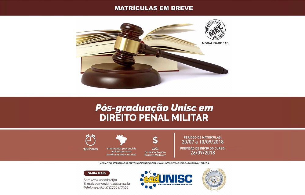 Para manifestar interesse na realização do curso de Direito Penal Militar promovida pela UNISC, clique AQUI
