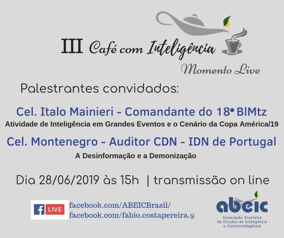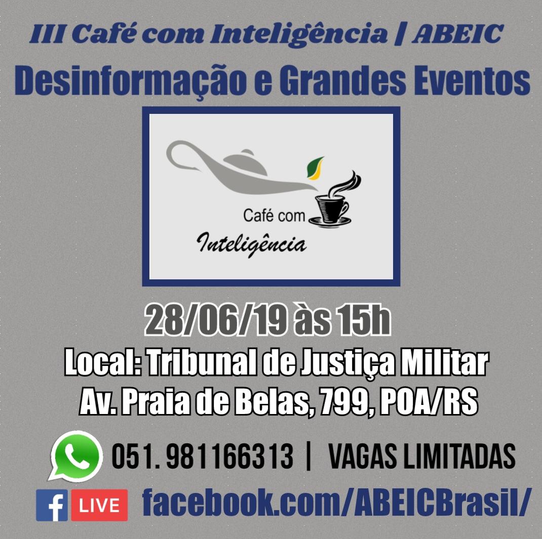 Será realizado, no plenário do Tribunal de Justiça Militar do Estado do Rio Grande do Sul, a próxima edição do "Café com inteligência", que terá como tema "Desinformação e Grande Eventos", no dia 28 de junho de 2019, às 15 horas.