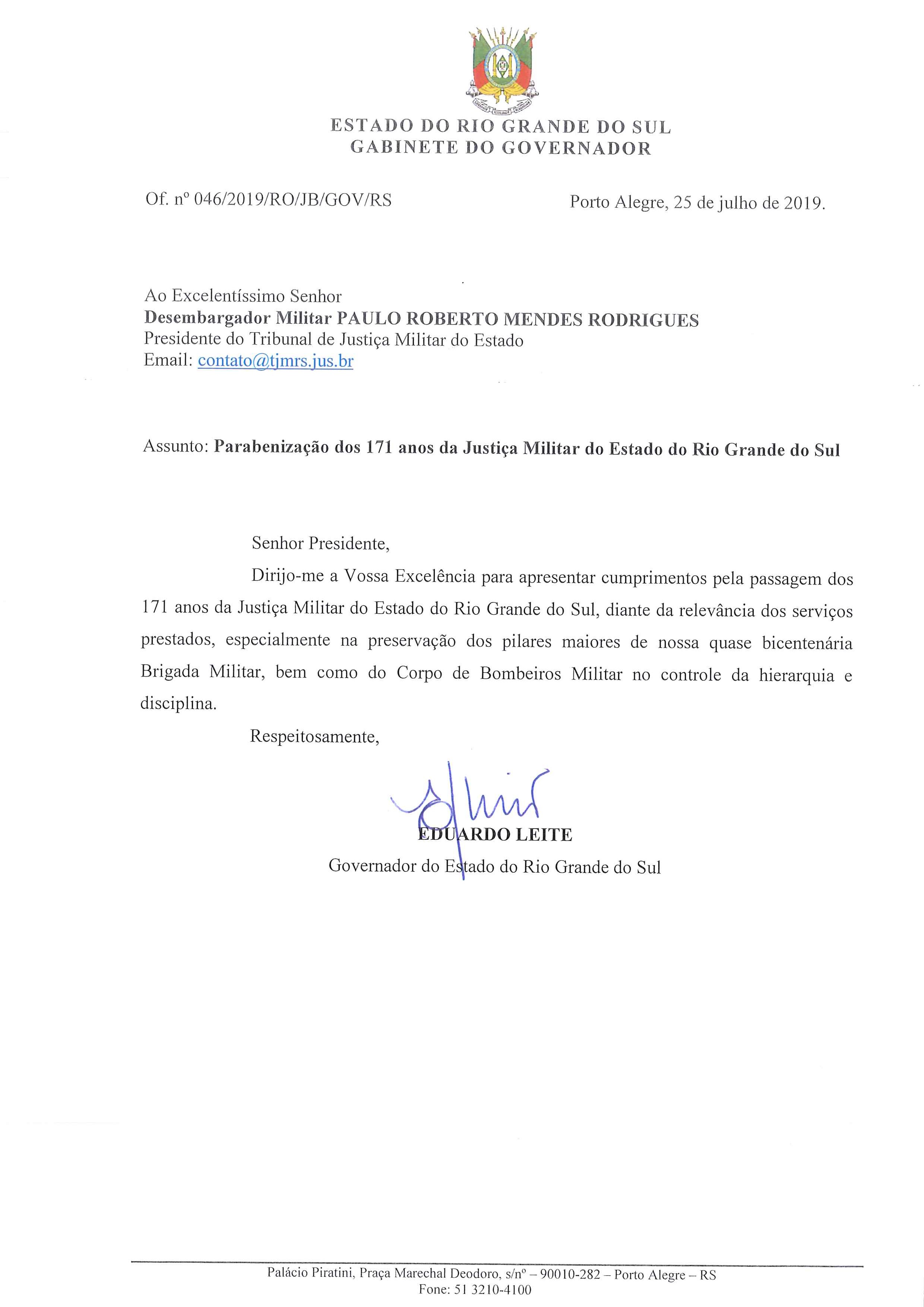Governador do Estado, Eduardo Leite, parabeniza a JME pelo seu aniversário de 171 anos