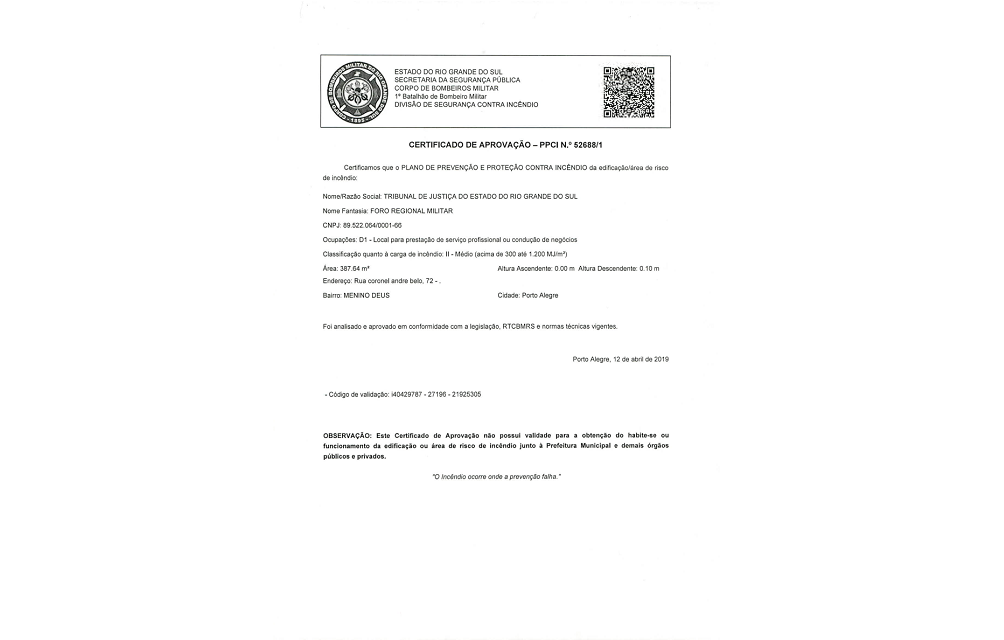 Nessa segunda-feira (29 de abril), a Justiça Militar do Estado do Rio Grande do Sul obteve o Certificado de aprovação do PPCI n.º 5688/1 (anexo), referente ao Prédio da 2ª Auditoria Militar de Porto Alegre.