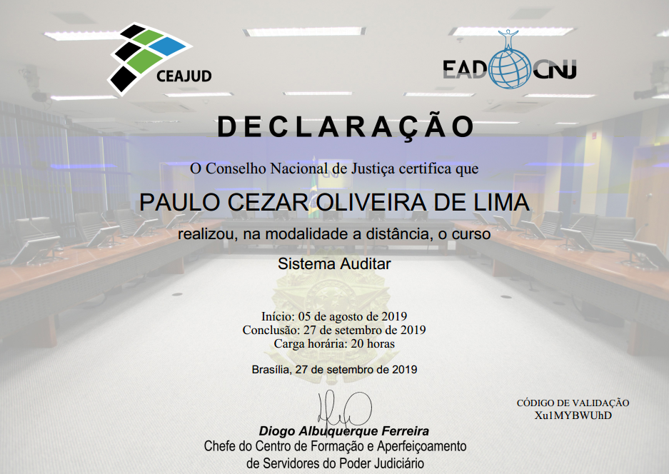 No período de 5 de agosto à 27 de setembro do corrente ano, os Servidores do TJM, Paulo Cezar Oliveira de Lima e Elisabete Simões da Cruz do NCI, realizaram através do CNJ, um curso de capacitação para manuseio e instalação do sistema AUDITAR.