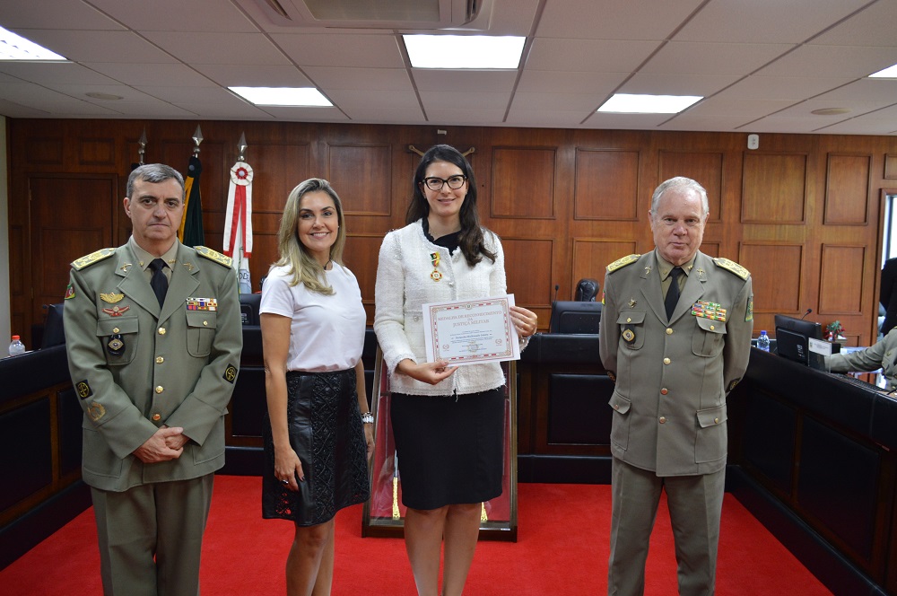 Em seguida, a Juíza-Auditora Substituta da 3ª Circunscrição Judiciária Militar, Natascha Maldonado Severo, foi chamada ao local de destaque do Plenário para receber a medalha alusiva aos 170 anos da JME/RS, a qual foi entregue pelo Juiz Militar Fábio Duarte Fernandes e pela Juíza Substituta da 1ª Auditoria Militar de Porto Alegre, Karina Dibi Kruel do Nascimento.