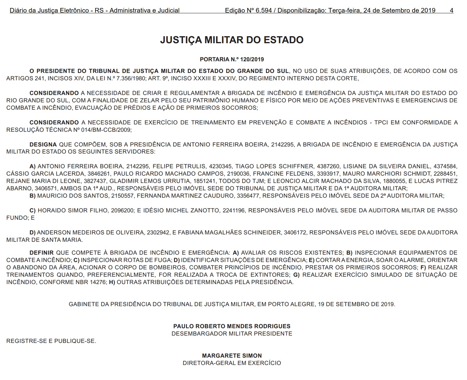 Na tarde desta terça-feira, a Justiça Militar instituiu sua Brigada de Incêndio, nos termos da portaria n.º 120/2019 da JME, publicada no Diário da Justiça Eletrônico n.º 6.594, disponibilizada hoje, 24 de setembro de 2019.