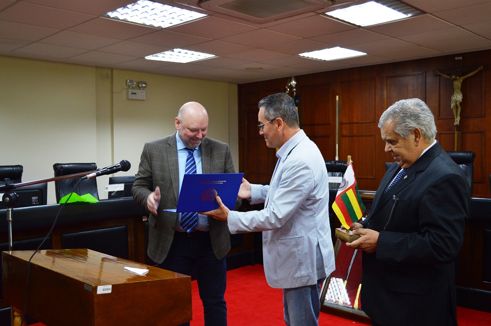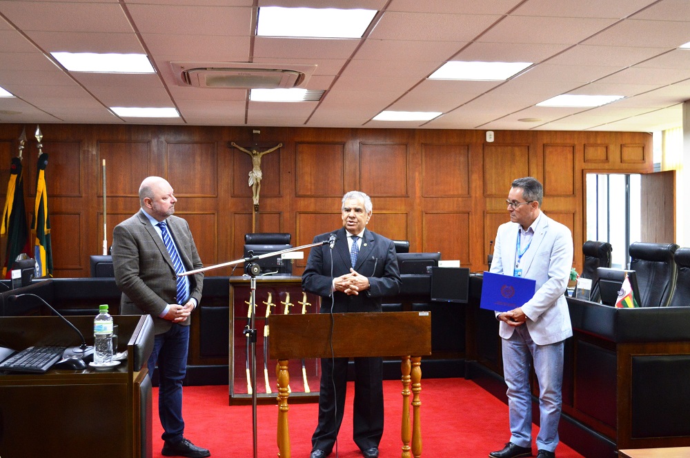 Ao término da palestra, o Diretor da EJM convidou o Corregedor-Geral da JMERS, Juiz Civil Amilcar Fagundes Freitas Macedo, para realizarem a entrega de uma homenagem (uma bandeirola alusiva ao TJM e um certificado do evento) ao palestrante. Por fim, o palestrante concedeu à biblioteca do TJMRS três exemplares de obras de sua autoria.