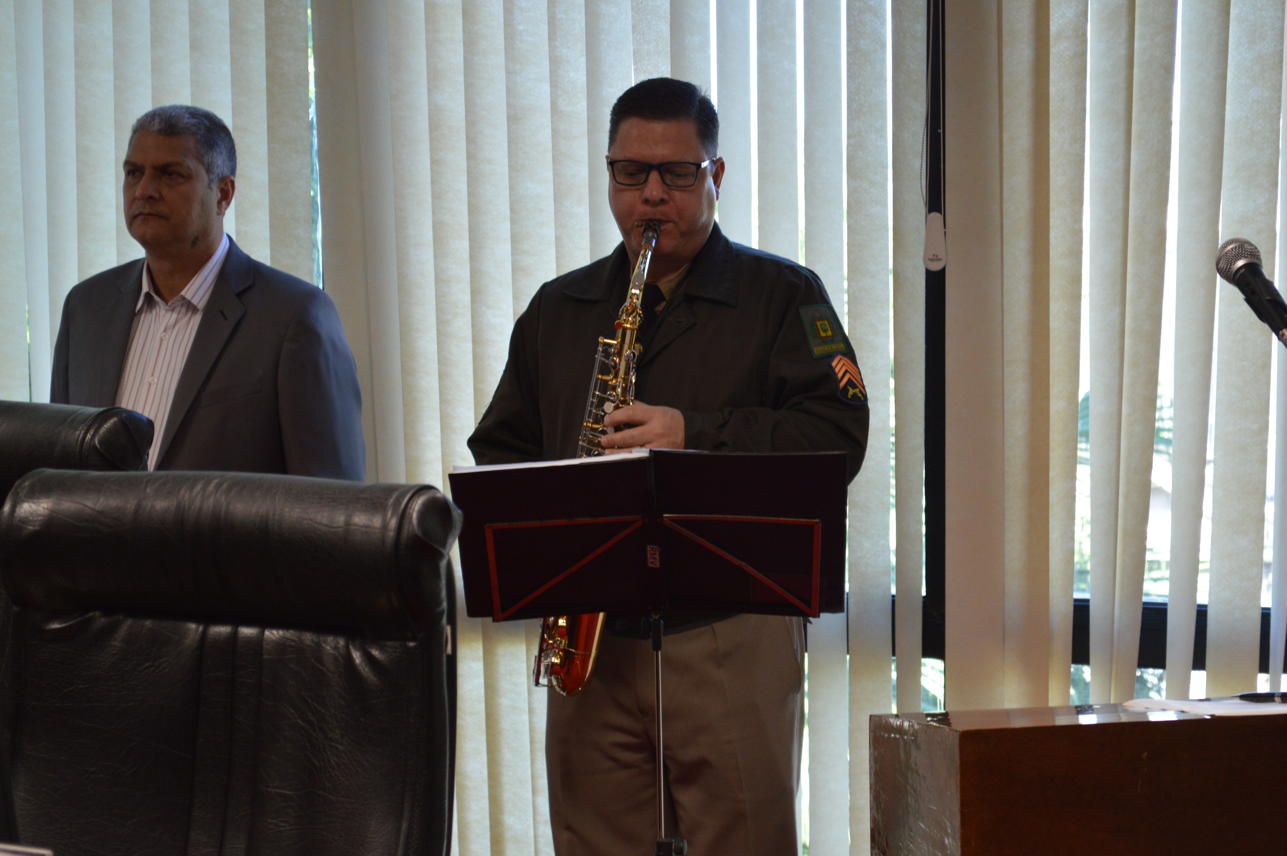 O Presidente do TJM proferiu um breve discurso, oportunidade em que foi executado o Hino Rio Grandense, em peça solo, pelo Sgt. Carlos Roberto Teixeira Kettz, sendo seguido pelo encerramento oficial da Sessão Solene, proferido pelo Presidente da Corte Castrense.