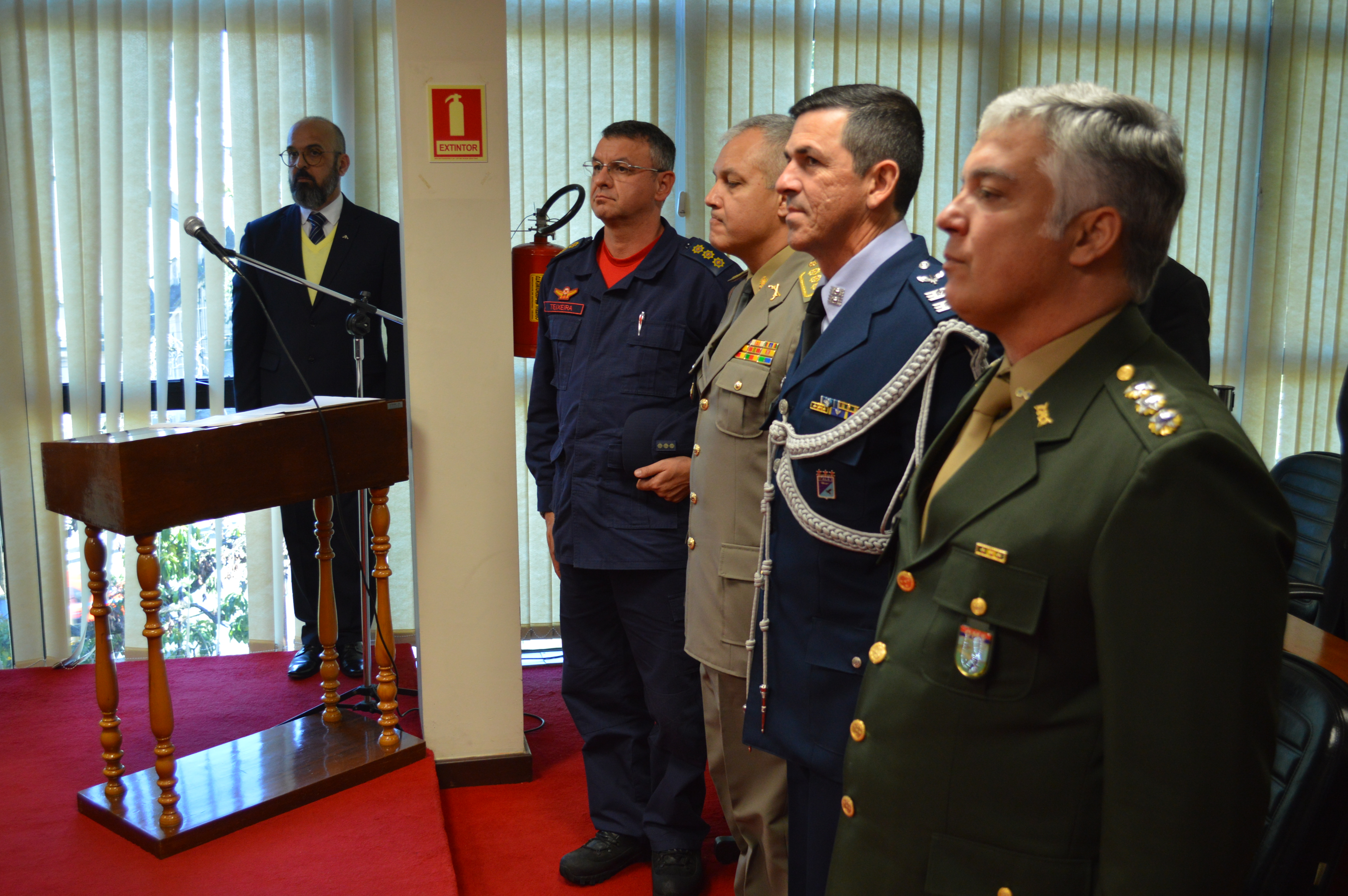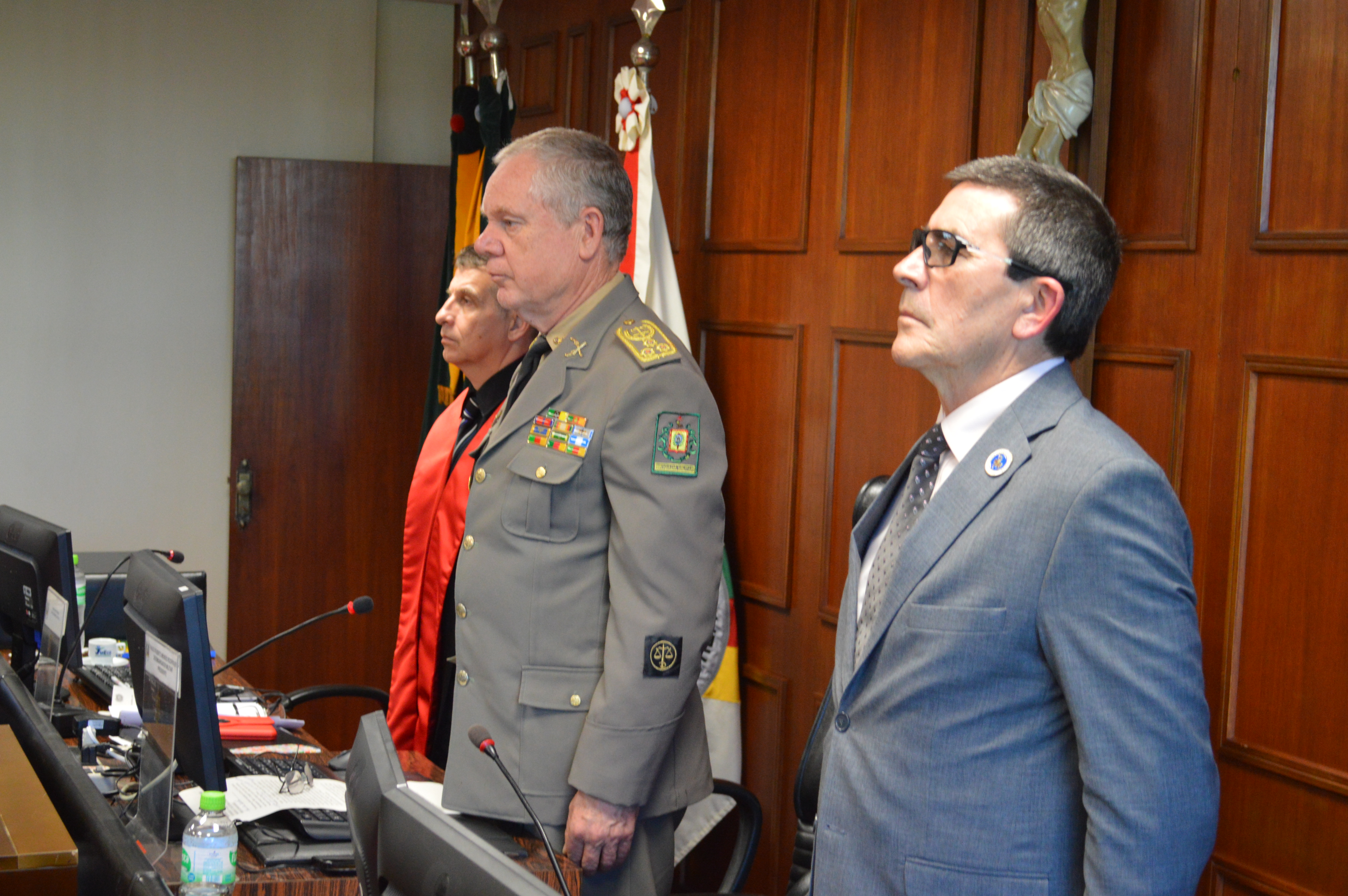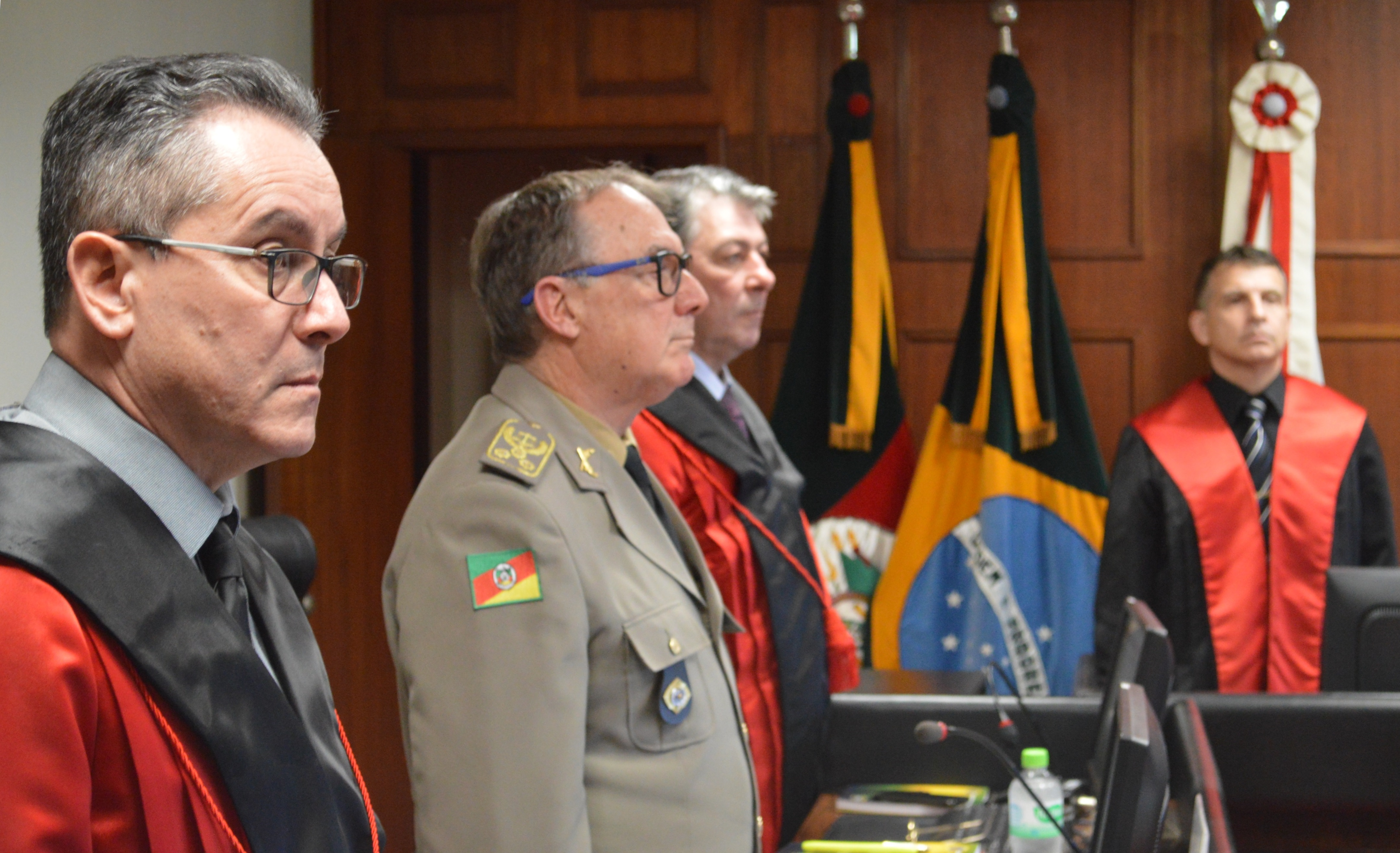 De início, o Mestre de Cerimônias, Felix Alexandre Grivot Neto, realizou as introduções necessárias, sendo seguido pela abertura oficial da Sessão Solene, proclamada pelo Presidente do Tribunal de Justiça Militar do Estado (TJMRS), Desembargador Militar Paulo Roberto Mendes Rodrigues, oportunidade em que foi executado o Hino Nacional, em peça solo, pelo Sgt. Carlos Roberto Teixeira Kettz.