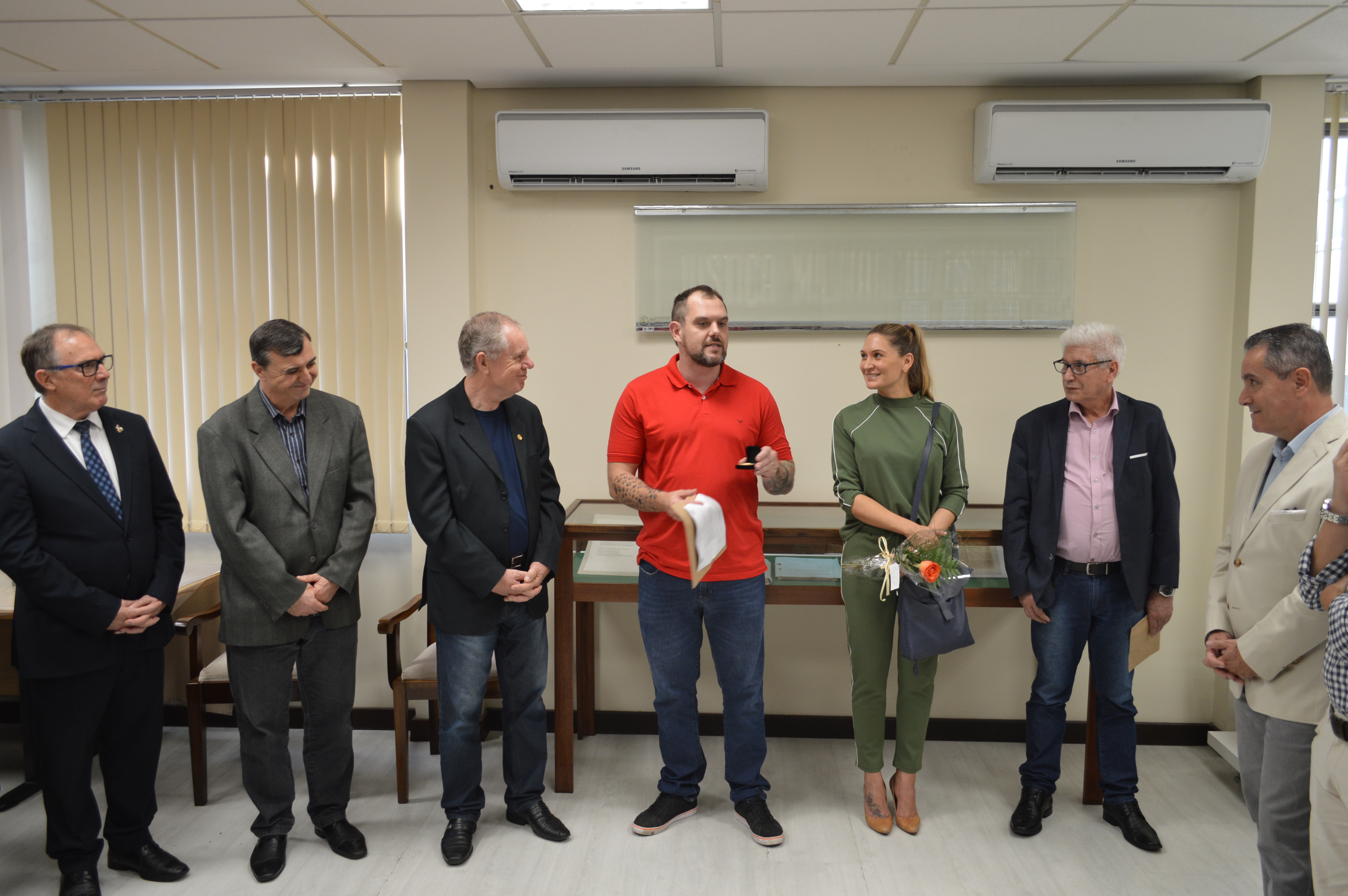 A homenagem se deu através da entrega, realizada pelo Des. Militar Fábio Duarte Fernandes, da Moeda Institucional alusiva ao Centenário do TJM ao Deputado, e uma rosa entregue à sua esposa. O Deputado falou sobre sua trajetória de vida, seus valores e ressaltou a importância da Justiça Militar no controle das atividades desenvolvidas pelos Policiais Militares no cotidiano do policiamento ostensivo.