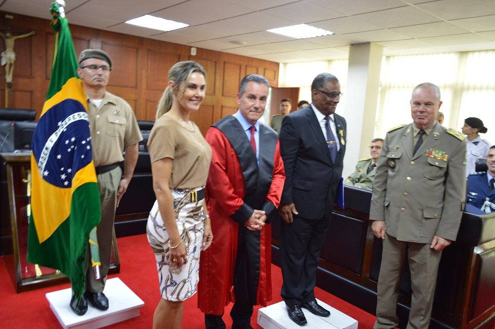 Após os homenageados se posicionarem, o Corregedor-Geral da JMERS e a Juíza de Direito Substituta da 1ª Auditoria Militar da JMERS, Karina Dibi Kruel do Nascimento, realizaram a entrega da Medalha de Reconhecimento da Justiça Militar, alusiva aos 170 anos da JMERS, ao General de Exército Luiz Carlos Rodrigues Padilha, Assessor de Relações Institucionais do Comando Militar do Sul.