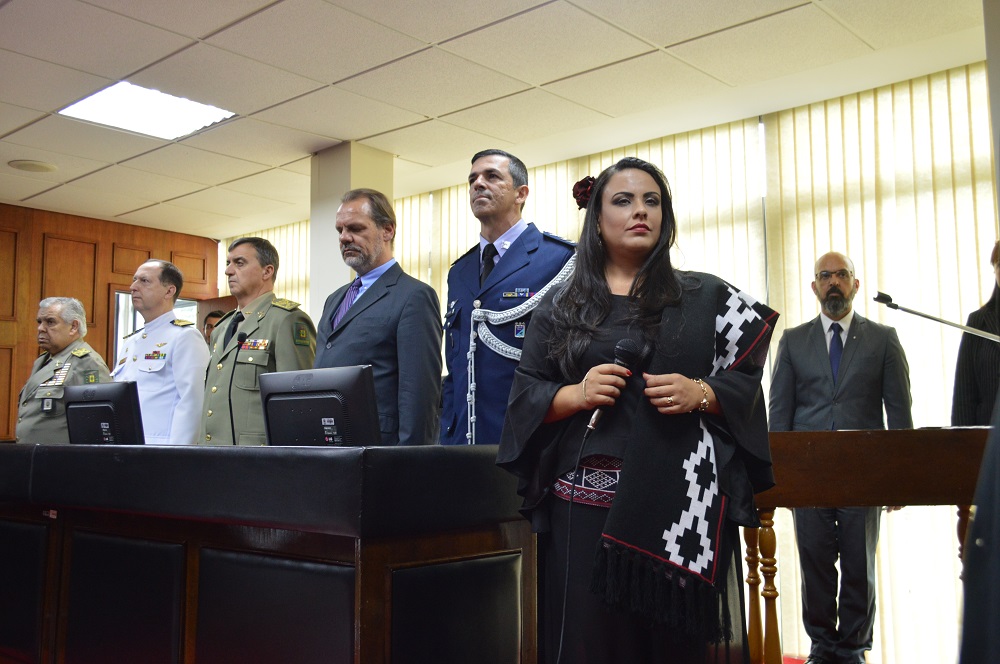 De início, o Mestre de Cerimônias, Felix Alexandre Grivot Neto, realizou as introduções necessárias, sendo seguido pela abertura oficial da sessão solene, proclamada pelo Presidente do Tribunal de Justiça Militar do Estado (TJMRS), Juiz Militar Paulo Roberto Mendes Rodrigues, oportunidade em que foi executado o Hino Nacional, em peça artística, pela cantora, gaúcha, Liane Tavares.