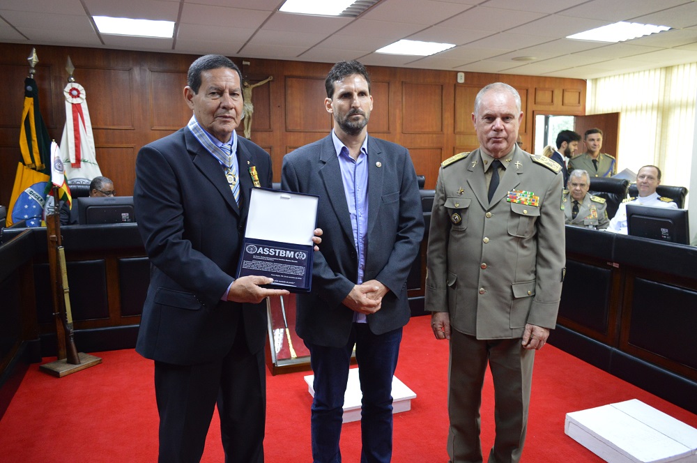 Na sequência, iniciaram-se as homenagens da grande família brigadiana ao Vice-Presidente da República eleito, começando pela entrega da medalha dos 180 anos da Brigada Militar, conferida pelo Subcomandante-Geral da instituição, Cel. Eduardo Biacchi Rodrigues, que, neste ato, representava o Comandante-Geral. O Vice Presidente da Associação dos Oficiais da Brigada Militar, Cel. Becker, conferiu uma placa de honra ao Vice-Presidente da República eleito. O Presidente da Associação dos Oficiais Estaduais do Rio Grande do Sul, Elias Daniel Poncio, concedeu uma homenagem ao Gen. Mourão. O 2º Vice-Presidente da Associação dos Sargentos, Subtenentes e Tenentes da Brigada Militar, Daltro Quadros Duarte, conferiu uma placa ao Gen. Mourão. E, encerrando o segundo momento de homenagens da Sessão Solene, o Vice-Presidente da Associação Beneficente Antônio Mendes Filho, dos Servidores de Nível Médio da Brigada Militar, Solis Paim, agraciou o Gen. Mourão também com uma placa.