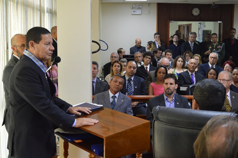 [...] General Mourão, hoje Vice-Presidente do Brasil eleito, Vossa Excelência é um exemplo a todos nós militares. A foto que colocamos nos monitores de nosso Tribunal bem representa a sua história, um Comandante à frente de sua tropa, marchando forte, dando o exemplo, apontando para o norte e caminhando para lá. Saiba, Vossa Excelência, que caminhamos nos balizando a seu exemplo. Nosso TJM é muito pequeno, mas grande no trabalho e na defesa de sua manutenção. Também somos guerreiros, estamos sempre em QAP (como os policiais dizem), prontos para combater o bom combate. Temos adversários que cada vez mais mínguam, pois sabem que estamos em caminhada rápida para à modernização. Nesse norte, destaco que a partir do dia 07 de janeiro do próximo ano, faltando, portanto, poucos dias, estaremos com todos os nossos processos administrativos e judiciais virtualizados. Somos possuidores de três selos ouros concedidos pelo Conselho Nacional de Justiça, temos um tempo de resposta muito célere. Hoje uma ação penal dura pouco mais de um ano e nossas apelações criminais e cíveis não ultrapassam 60 dias. Ah, ainda, dizer que, nos últimos cinco anos, apenas uma decisão nossa foi modificada pelos Tribunais Superiores. Portanto, estamos nos qualificando cada vez mais para ajudar a nossa Brigada Militar e o nosso Corpo de Bombeiros Militar a continuarem a ser um referencial de órgão militar, no exercício de suas atividades constitucionais, para o nosso estado e país. Ao cabo, Senhor General, estamos juntos! Como Vossa Excelência referiu - enquanto exercia o cargo de Comandante Militar do Sul, somos gratos pela sua presença e invocamos as forças superiores para que Vossa Excelência obtenha êxito em mais esta caminhada que se inicia, pois temos convicção que inteligência, garra, espírito guerreiro e apoio de nosso povo não lhe faltará. Um grande abraço.”