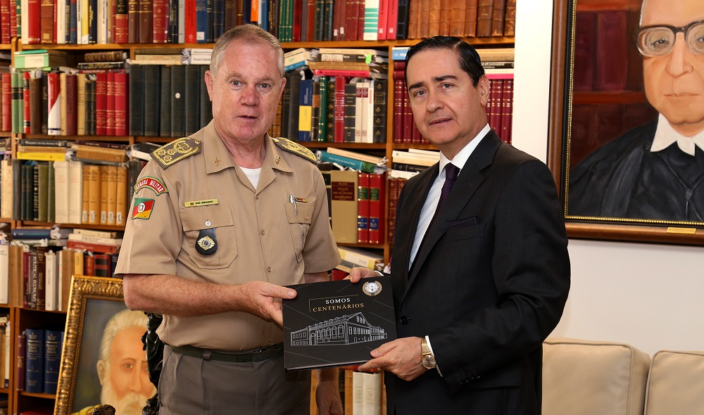 Na tarde dessa quarta-feira (23 de janeiro), a Justiça Militar do Estado do Rio Grande do Sul, representada pelo Presidente do TJM, Juiz Militar Paulo Roberto Mendes Rodrigues, homenageou o Presidente do Tribunal Regional Federal da 4ª Região, Desembargador Carlos Eduardo Thompson Flores Lenz, com a entrega do Livro Institucional do Centenário do Tribunal Militar.