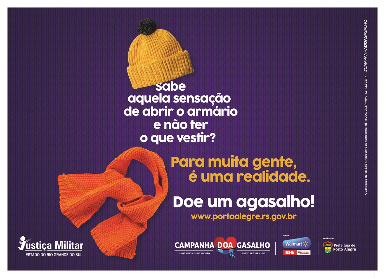 Para isso, a partir dessa terça-feira (29 de maio), a Justiça Militar do Estado adere, como padrinho, a Campanha do Agasalho da Prefeitura Municipal de Porto Alegre, por intermédio da Secretaria Municipal de Desenvolvimento Social e Esporte.
