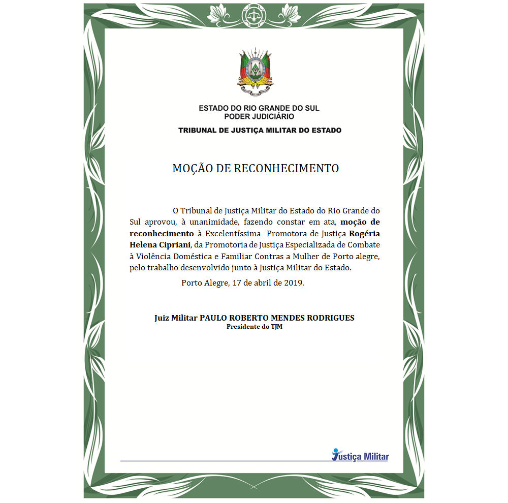 Na tarde dessa quarta-feira (17 de abril) a Justiça Militar do Estado do Rio Grande do Sul rendeu homenagem à Promotora de Justiça que atuou na 1ª Auditoria Militar de Porto Alegre de novembro de 2017 a abril de 2019.