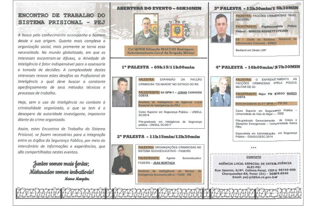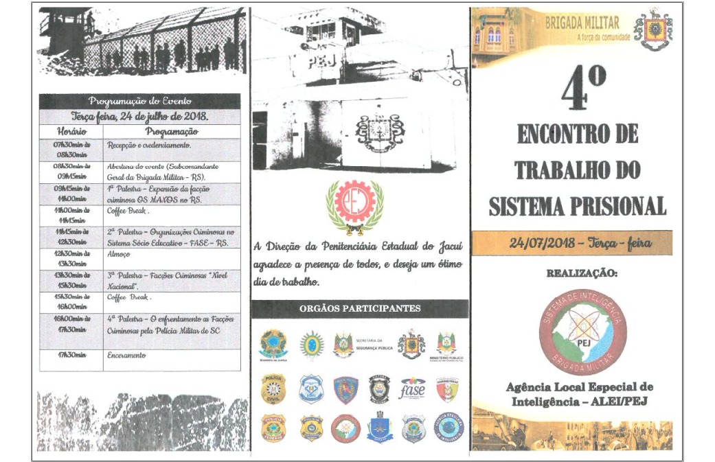 Na manhã dessa terça-feira (24 de Julho), a Justiça Militar do Estado do Rio Grande do Sul, representada pelo juiz presidente do Tribunal de Justiça Militar do Estado do Rio Grande do Sul, Cel. Paulo Roberto Mendes Rodrigues, prestigiou o 4º Encontro de Trabalho do Sistema Prisional, evento realizado pela Agência Local Especial de Inteligência – ALEI/PEJ, na Cidade de Charqueadas – RS.