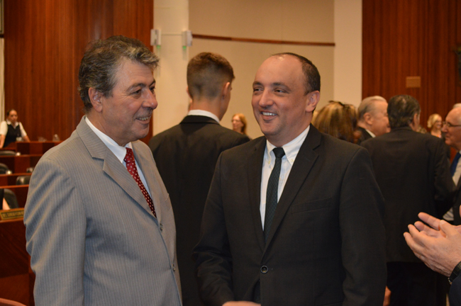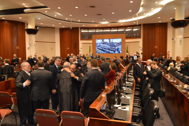 O juiz-presidente do Tribunal de Justiça Militar do Rio Grande do Sul (TJM-RS), Fernando Guerreiro de Lemos, acompanhou a posse da nova administração do Tribunal de Justiça do Rio Grande do Sul (TJ-RS), na tarde de hoje, em Porto Alegre. O desembargador Carlos Eduardo Zietlow Duro assumiu a presidência da Corte, para o biênio 2018-2020. Também foram empossados a desembargadora Maria Isabel de Azevedo Souza, para a 1ª vice-presidência; os desembargadores Almir Porto da Rocha Filho e Túlio Martins, para a 2ª e 3ª vice-presidência; e a desembargadora Denise Oliveira Cezar no cargo corregedora-geral da Justiça.