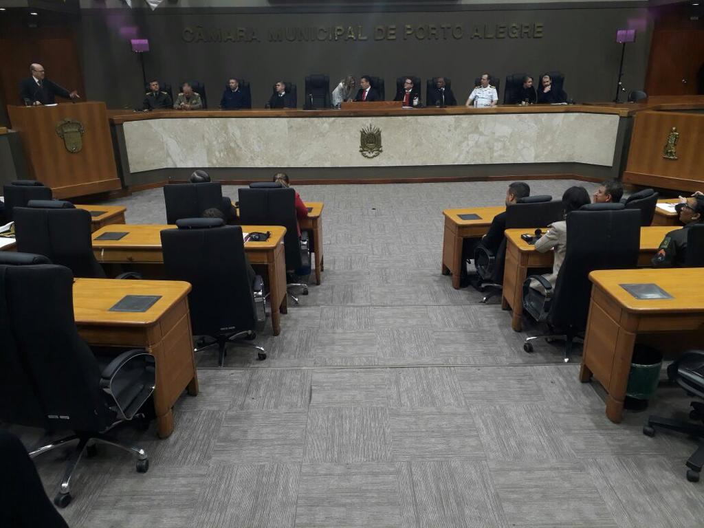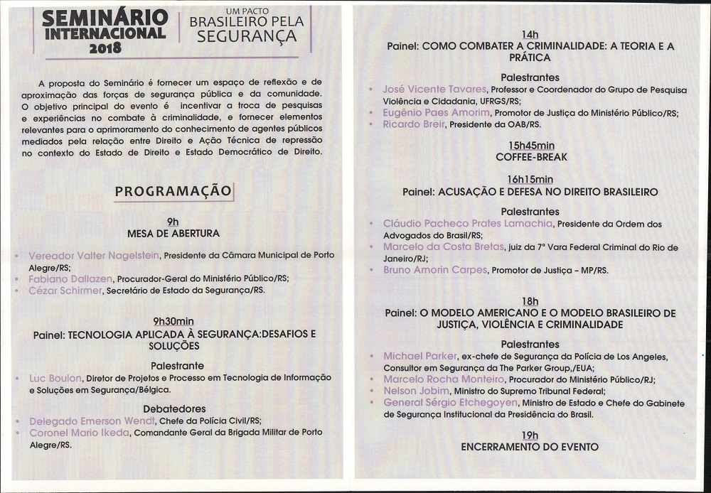 Na manhã dessa sexta-feira (3 de agosto), a Justiça Militar do Estado do Rio Grande do Sul, representada pelo juiz presidente do Tribunal de Justiça Militar do Estado do Rio Grande do Sul, Cel. Paulo Roberto Mendes Rodrigues, prestigiou o Seminário Internacional 2018 “UM PACTO PBRASILEIRO PELA SEGURANÇA”, promovido pela Câmara Municipal de Porto Alegre, no Plenário Otávio Rocha.