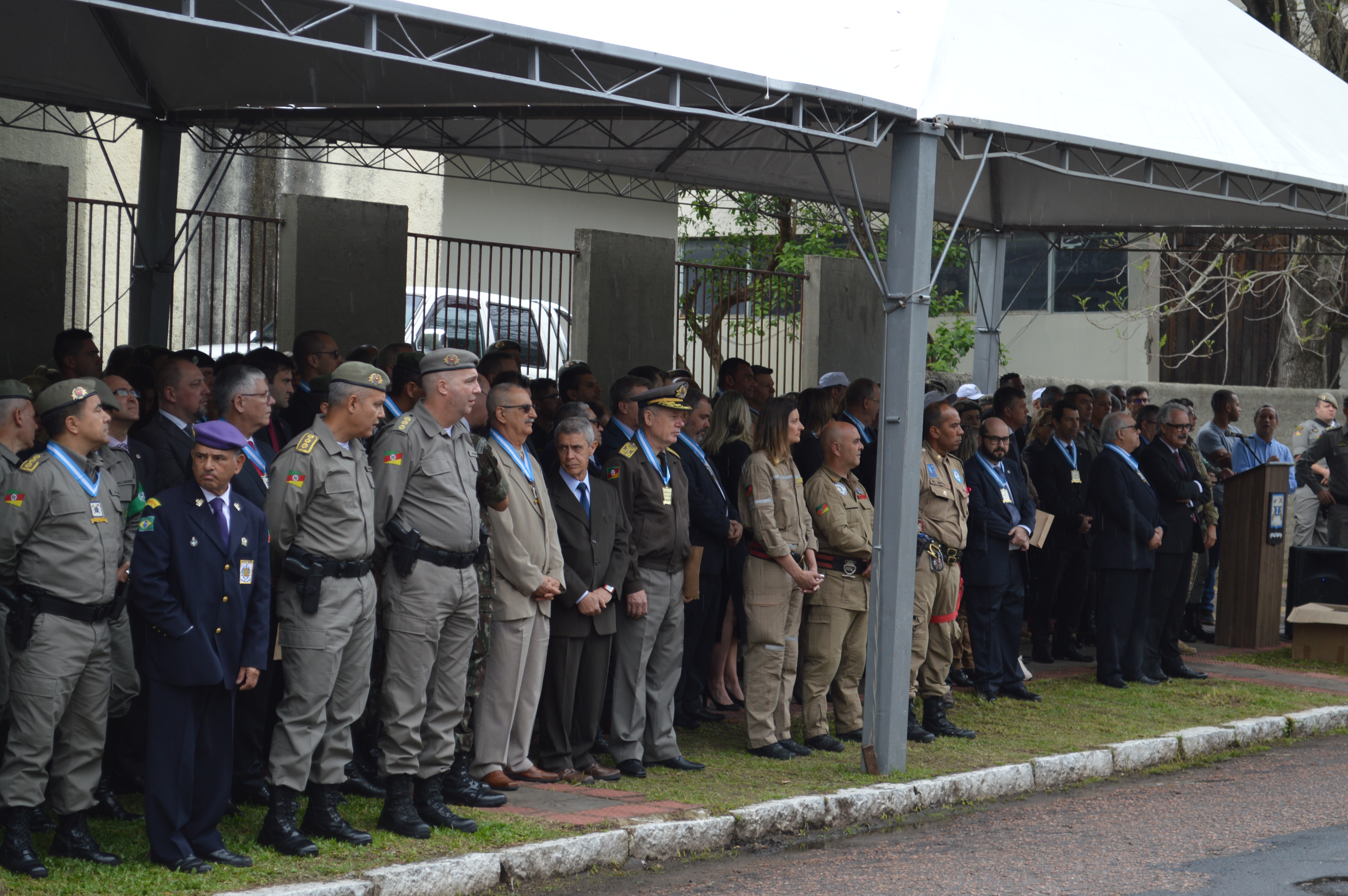 Na oportunidade o Presidente do TJM e o Dr. Herbert Schonhofen, dentre outras autoridades, receberam das mãos do Ten. Cel. Leandro Oliveira da Luz - Comandante do 1º BPM, a comenda representativa da unidade.
