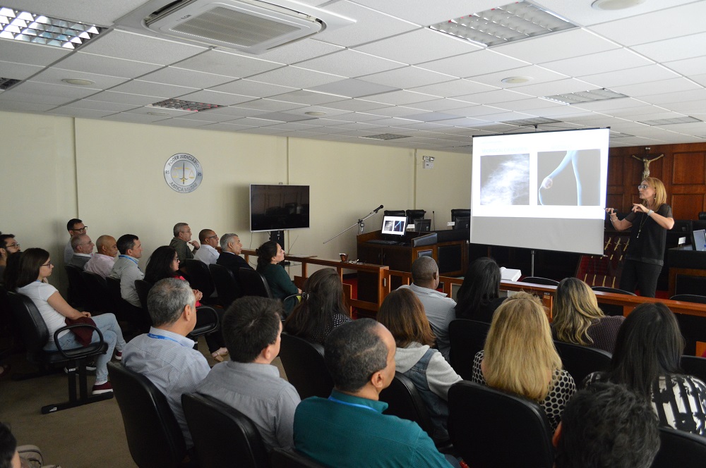 A palestra foi realizada no plenário do TJM e ministrada pela Dra. Ana Paula Muller e pelo Dr. Leonardo D’aló, ambos da equipe cirúrgica de oncologia e mastologia do Hospital Santa Casa. Na oportunidade foi ensinado a prevenção e os tratamentos do câncer de mama, assim como os procedimentos da cirurgia reparadora da mama.