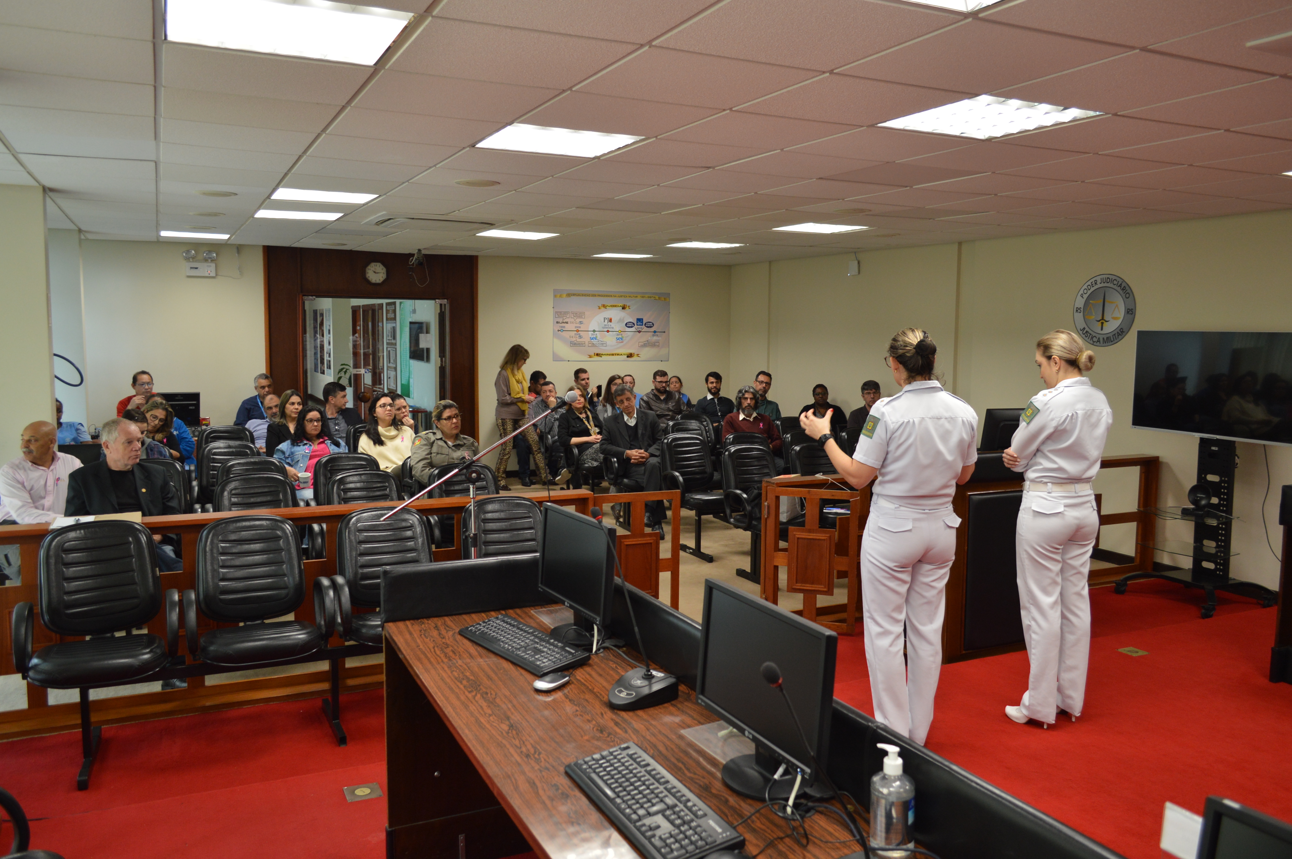 De início, o Mestre de Cerimônias do TJM, Félix Alexandre Grivot Neto, realizou a abertura oficial da palestra, passando a palavra às palestrantes Dra. Cristina Helena Luz Grecco, Franciele Anziliero e Maj. Martha Richter de Oliveira.