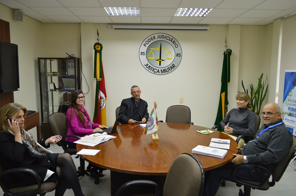 Na tarde dessa quinta-feira (17 de maio), ocorreu a reunião da Comissão de Regularização dos Imóveis da Justiça Militar do Estado, composta pelos servidores do Tribunal de Justiça Militar, Antonio Ferreira Boeira, Cassio Garcia Lacerda, Jéssica Borchartt da Silva de Lima, João Gilberto Arbogast Fontoura e Joseane Busato de Lima Veiga.