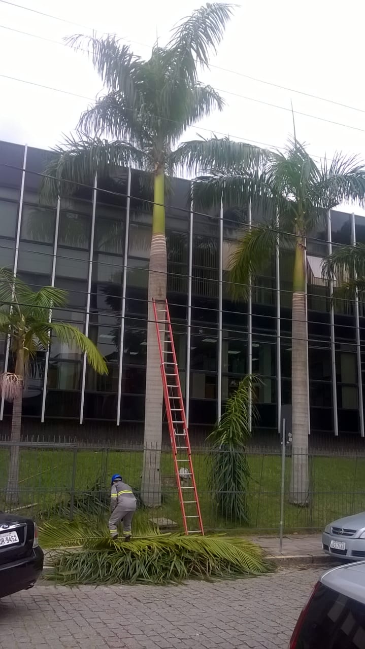 Na manhã dessa quarta-feira (06 de março), a Companhia Estadual de Energia Elétrica do Rio Grande do Sul realizou a poda de várias palmeiras imperiais que se encontram no pátio do TJM.