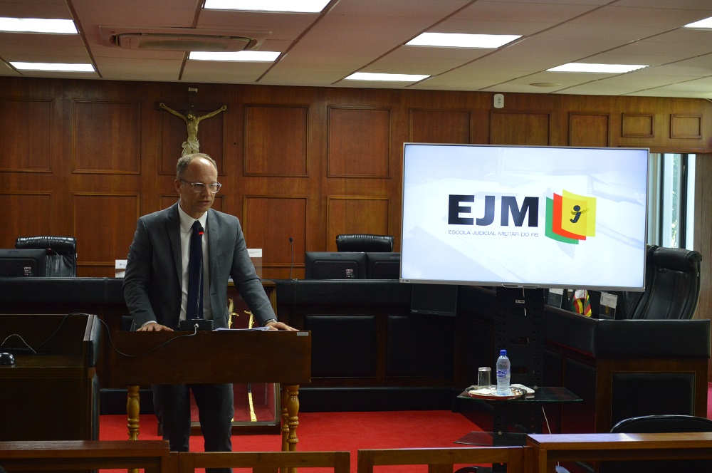 Após o Mestre de Cerimônias do TJM/RS, Felix Alexandre Grivot Neto, ter feitos as saudações iniciais, o palestrante se dirigiu ao local de destaque, onde iniciou sua palestra.