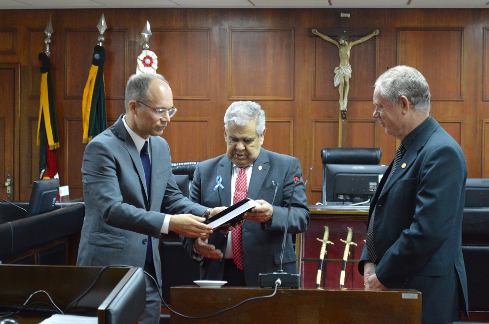 Ao término da palestra, o Diretor da EJM convidou o Presidente da Corte Castrense gaúcha, Juiz Militar Paulo Roberto Mendes Rodrigues, para acompanhar a entrega de uma homenagem (uma bandeirola alusiva ao TJM e um certificado do evento) ao palestrante. Após a entrega da homenagem, o palestrante concedeu à biblioteca do TJM um exemplar de sua obra recentemente publicada "Corrupão e improbidade administrativa".