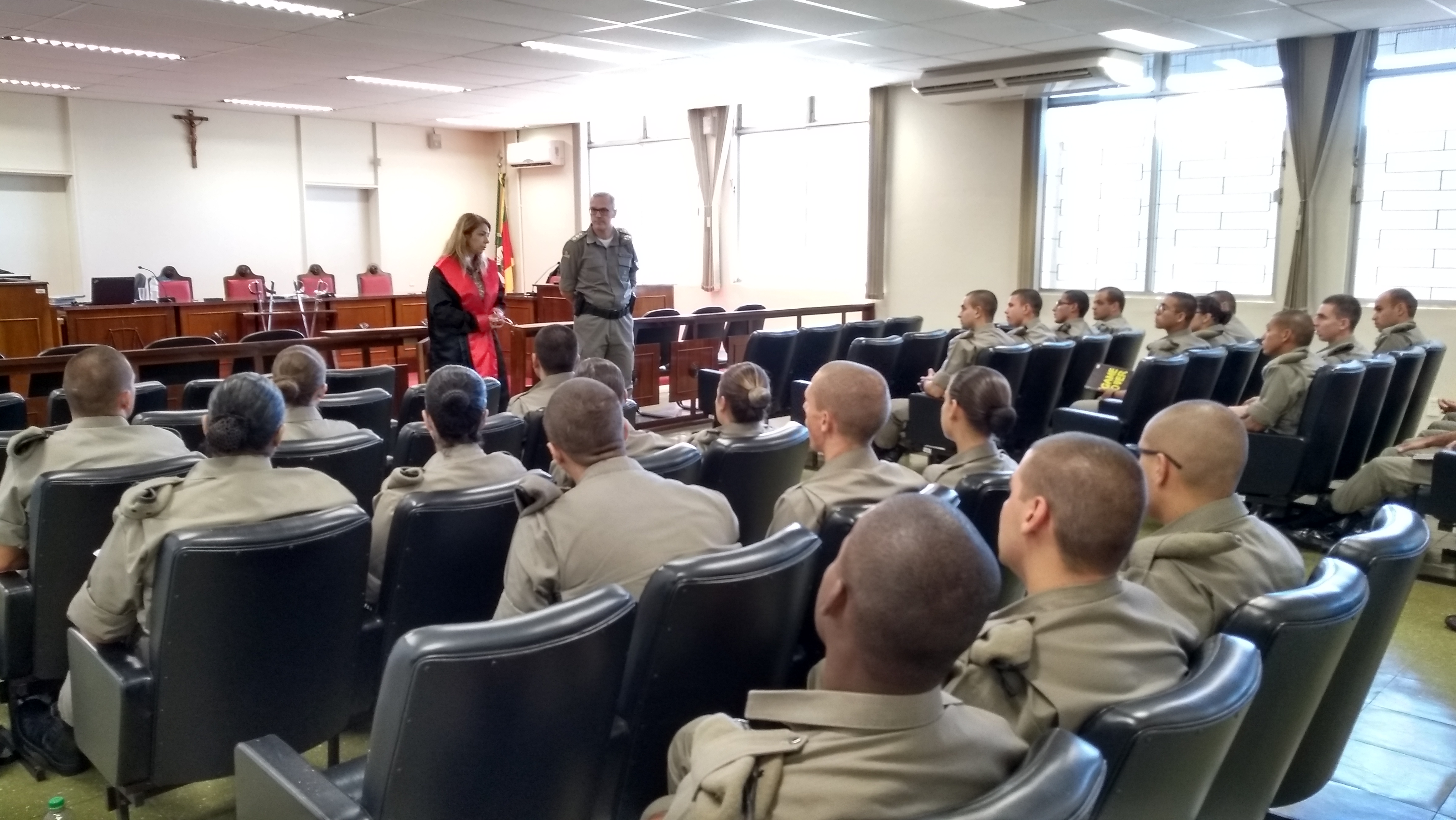 Na tarde dessa terça-feira (09 de abril), a Justiça Militar do Estado do Rio Grande do Sul recebeu visita de 29 alunos do Curso Básico de Formação Policial Militar do CRPO/Alto do Jacuí na Auditoria Militar de Passo Fundo. Os alunos-soldados ouviram a palestra proferida pela Dra. Mariluce Dias Bandeira, Juíza de Direto, e pelo Dr. Marcos Simões Petry, Promotor de Justiça, acerca da legislação, estrutura e funcionamento da Justiça Militar, e ao final da visita, acompanharam o cerimonial de julgamento.
