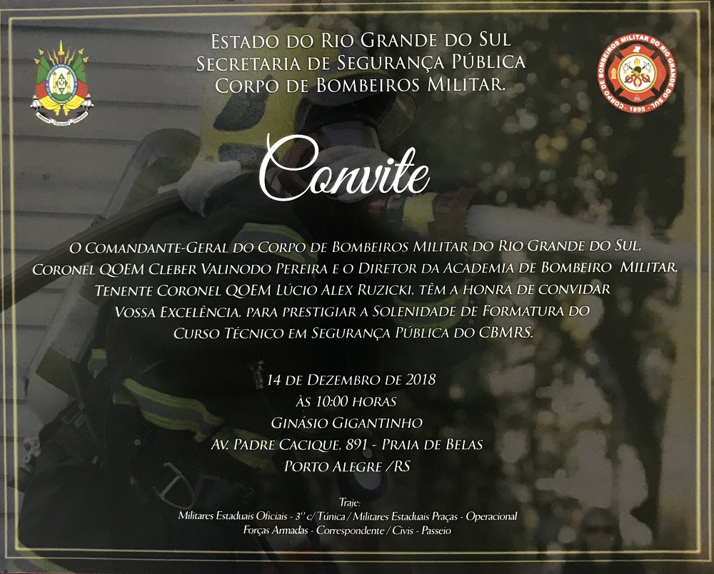 Na oportunidade, o Diretor da ABM realizou a entrega do convite para a formatura do Curso Técnico em Segurança Pública do Corpo de Bombeiros Militar do Rio Grande do Sul, que será realizada no dia 14 de dezembro de 2018.