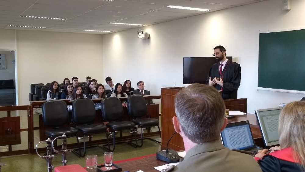 Na oportunidade os alunos acompanharam um cerimonial de julgamento e, posteriormente, assistiram ao vídeo institucional da JME. Logo após a Excelentíssima Dra. Mariluce Dias Bandeira, acompanhada pelo Dr. Marcos Simões Petry, Promotor de Justiça, e pela Dra. Micaela Faleiro Dal Maso Donadussi, Defensora Pública, explanou sobre o funcionamento da Justiça Castrense.
