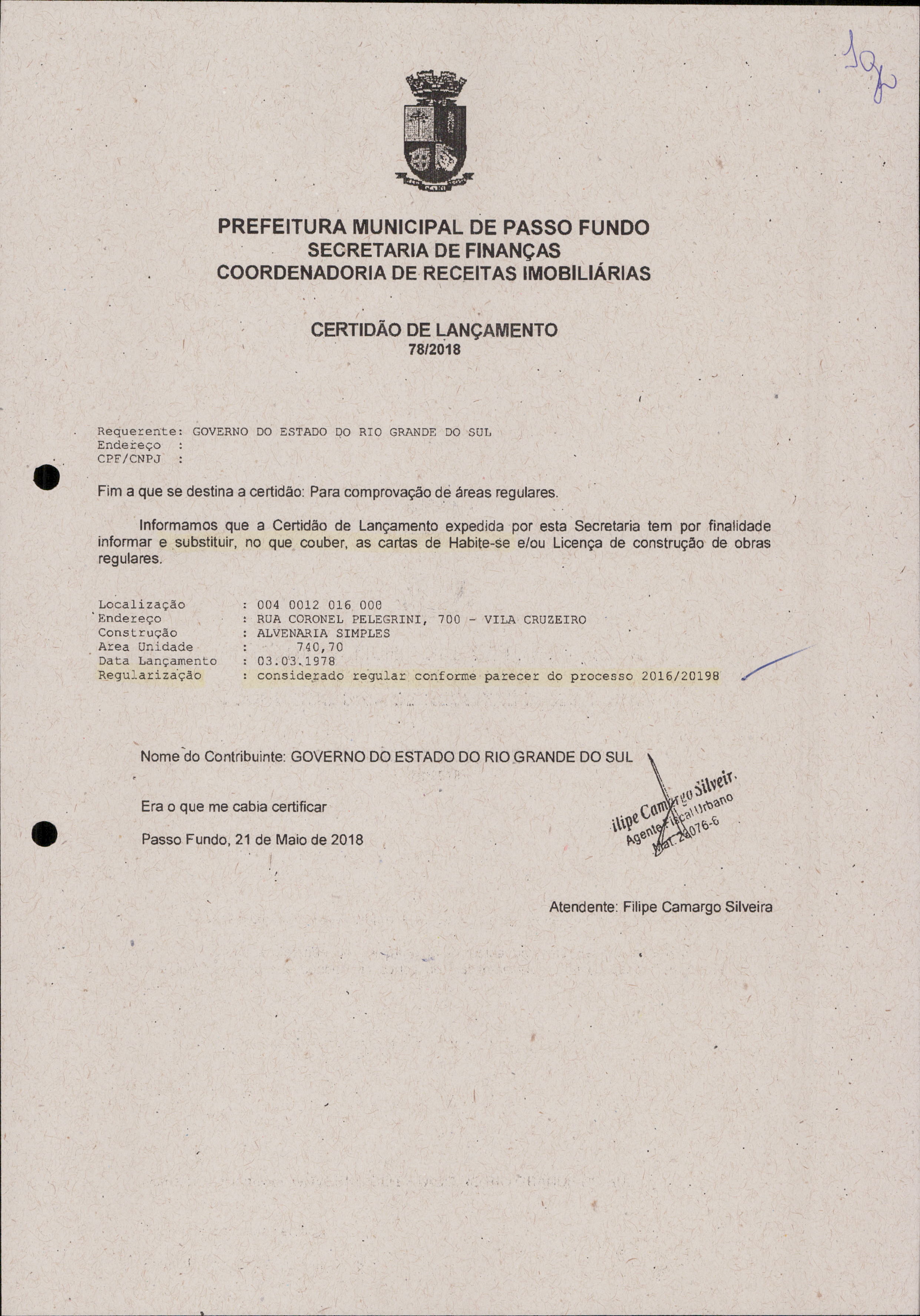 No dia 21 de maio de 2018, a Prefeitura Municipal de Passo Fundo, conforme certidão de lançamento n.º 78/2018, expedida pelo Agente Fiscal Urbano, Filipe Camargo Silveira, da Coordenadoria de Receitas Imobiliárias, firmou: