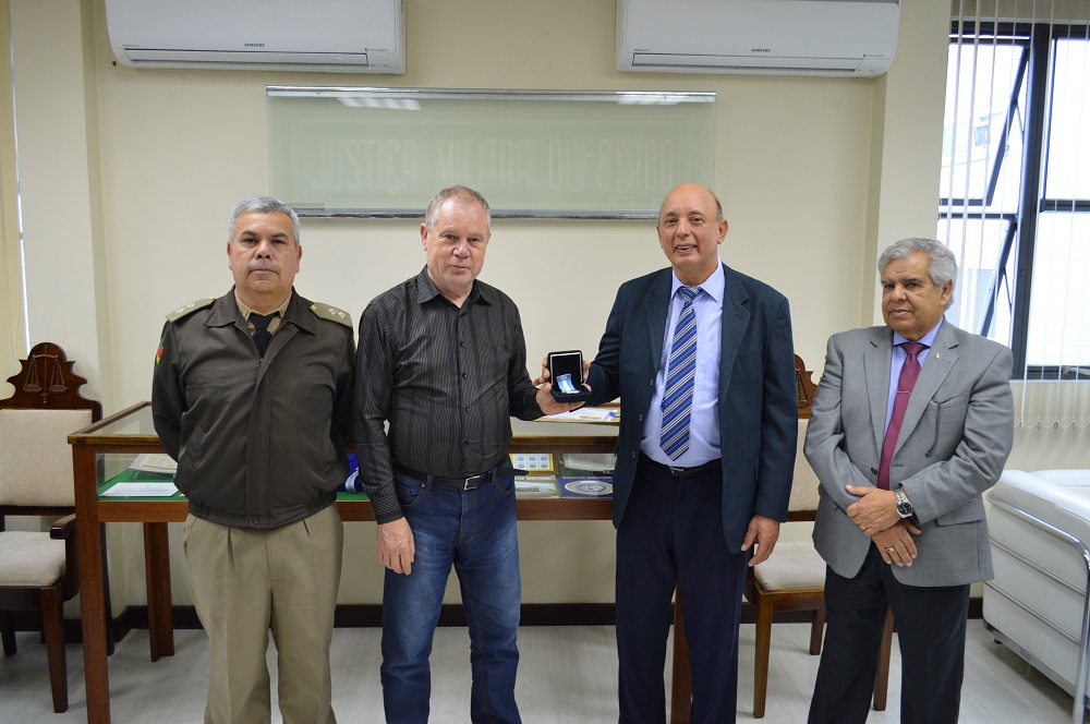 A homenagem se deu através de um discurso do presidente, seguido da entrega, realizada pelo vice-presidente do TJM/RS, juiz militar Antonio Carlos Maciel Rodrigues, da Moeda Institucional do Centenário do Tribunal Militar e por um certificado alusivo ao evento ao presidente da APESP, Sgt. Claudio Medeiros Bayerle.