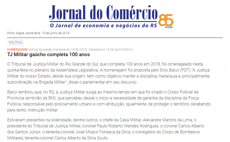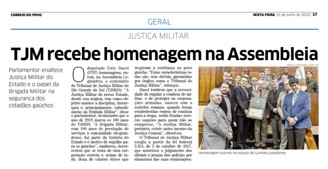 Jornais noticiam o Grande Expediente alusivo ao Centenário do TJM/RS