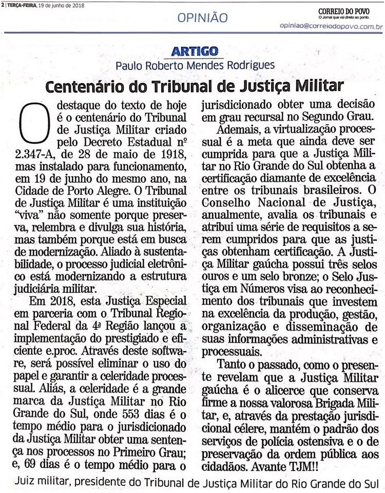 Jornal Correio do Povo - Centenário do Tribunal de Justiça Militar