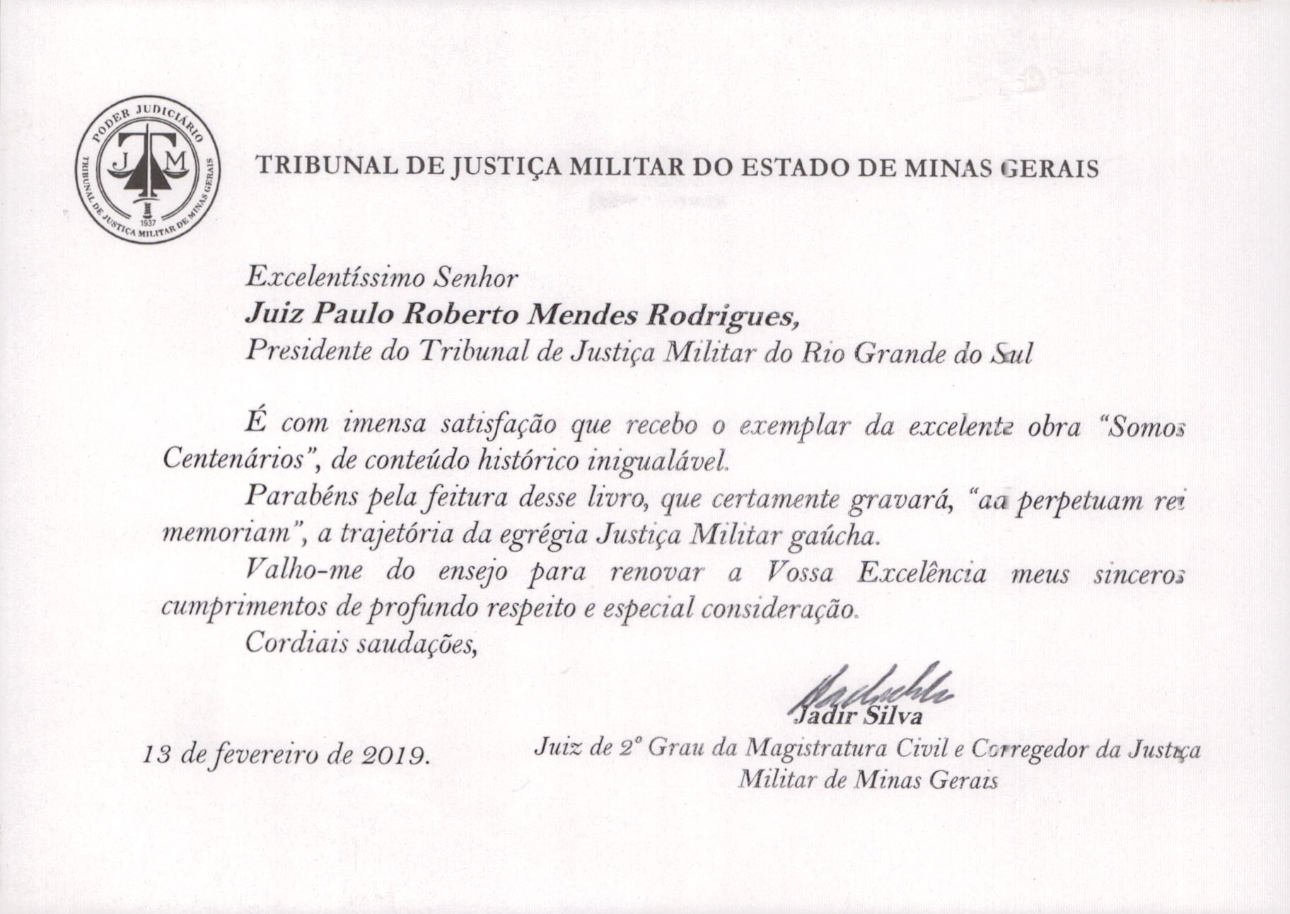 Juiz Corregedor da JME/MG agradece entrega de exemplar do livro