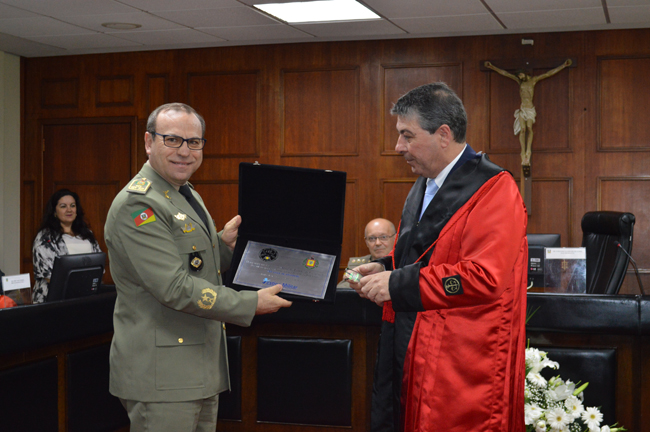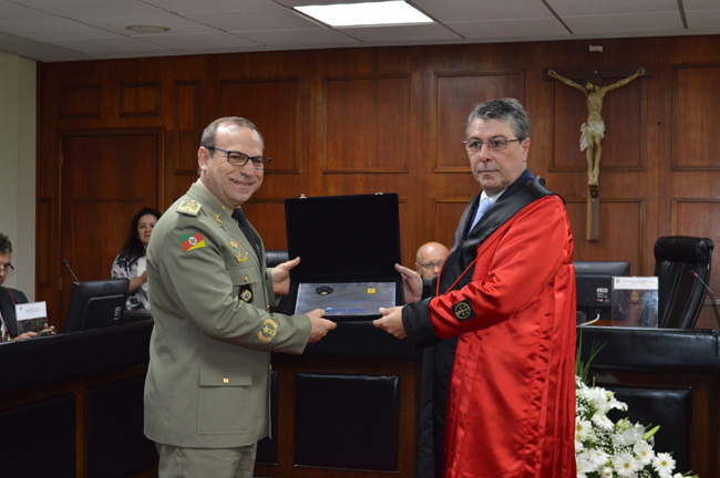 Devido à passagem dos 180 anos da força policial gaúcha, o Tribunal de Justiça Militar (TJM/RS), prestou homenagem à Brigada Militar do Estado do Rio Grande do Sul, na tarde de hoje (13 de novembro), durante sessão solene no plenário da Corte, em Porto Alegre. O juiz presidente do TJM/RS, Fernando Guerreiro de Lemos, entregou uma placa comemorativa ao comandante geral da BM, coronel Andreis Silvio Dal’Lago, em honra aos grandes serviços da corporação para com os gaúchos.