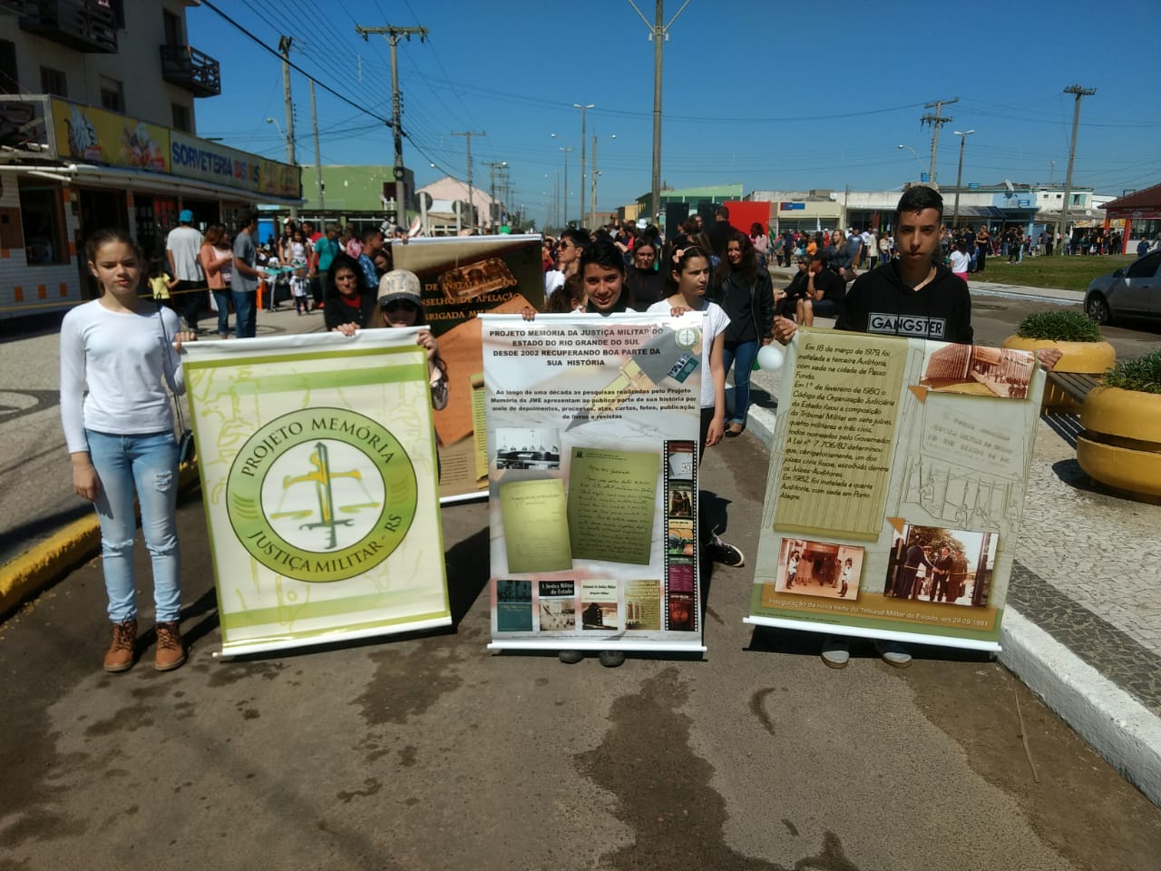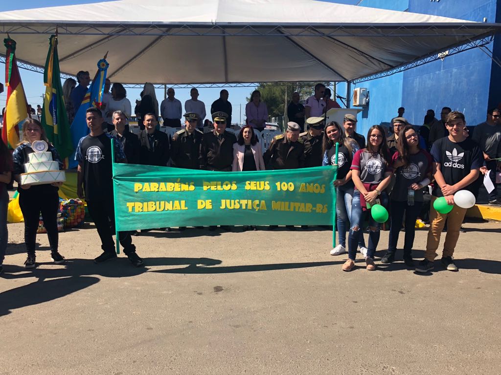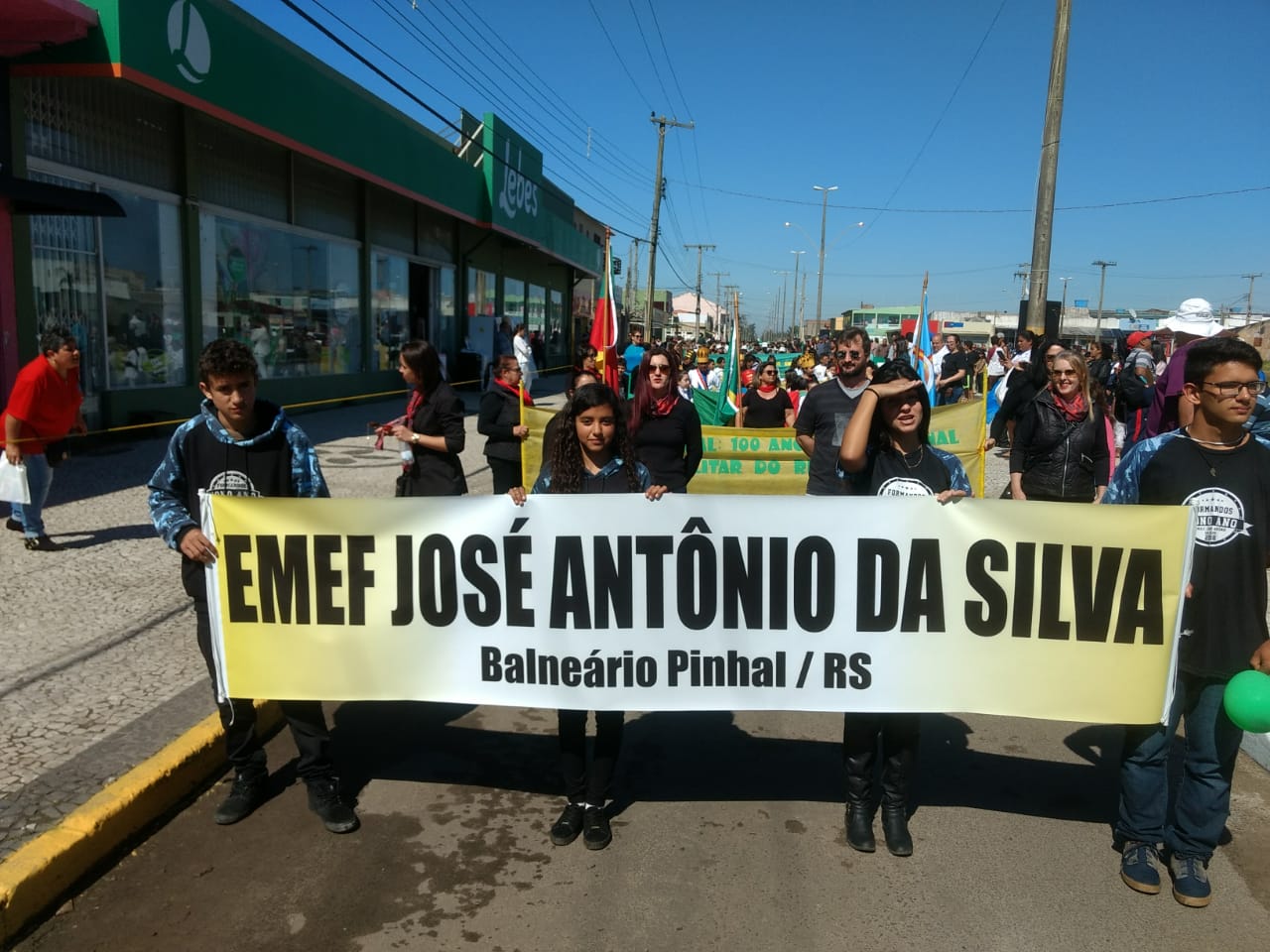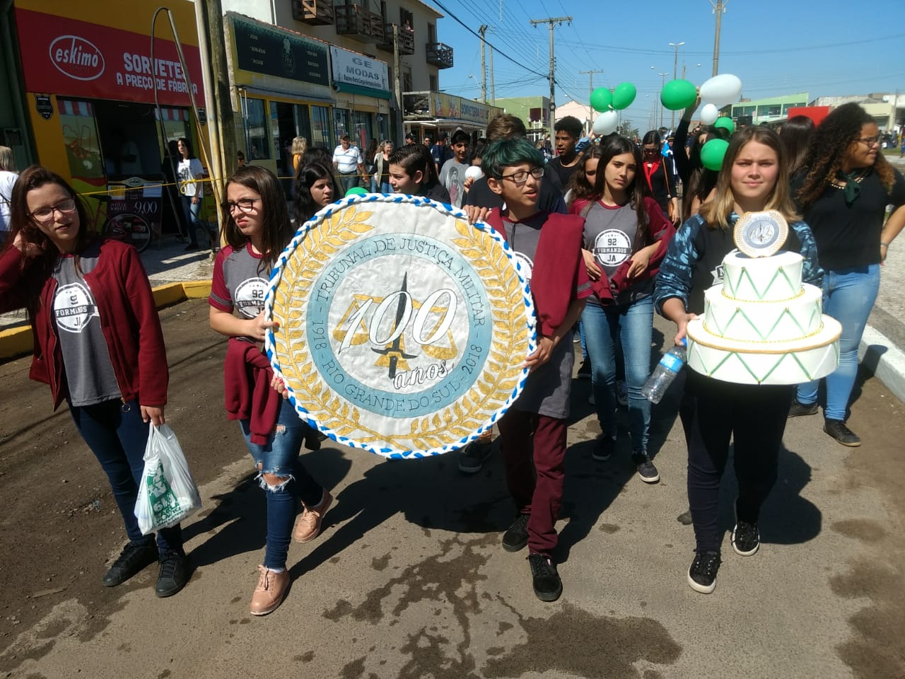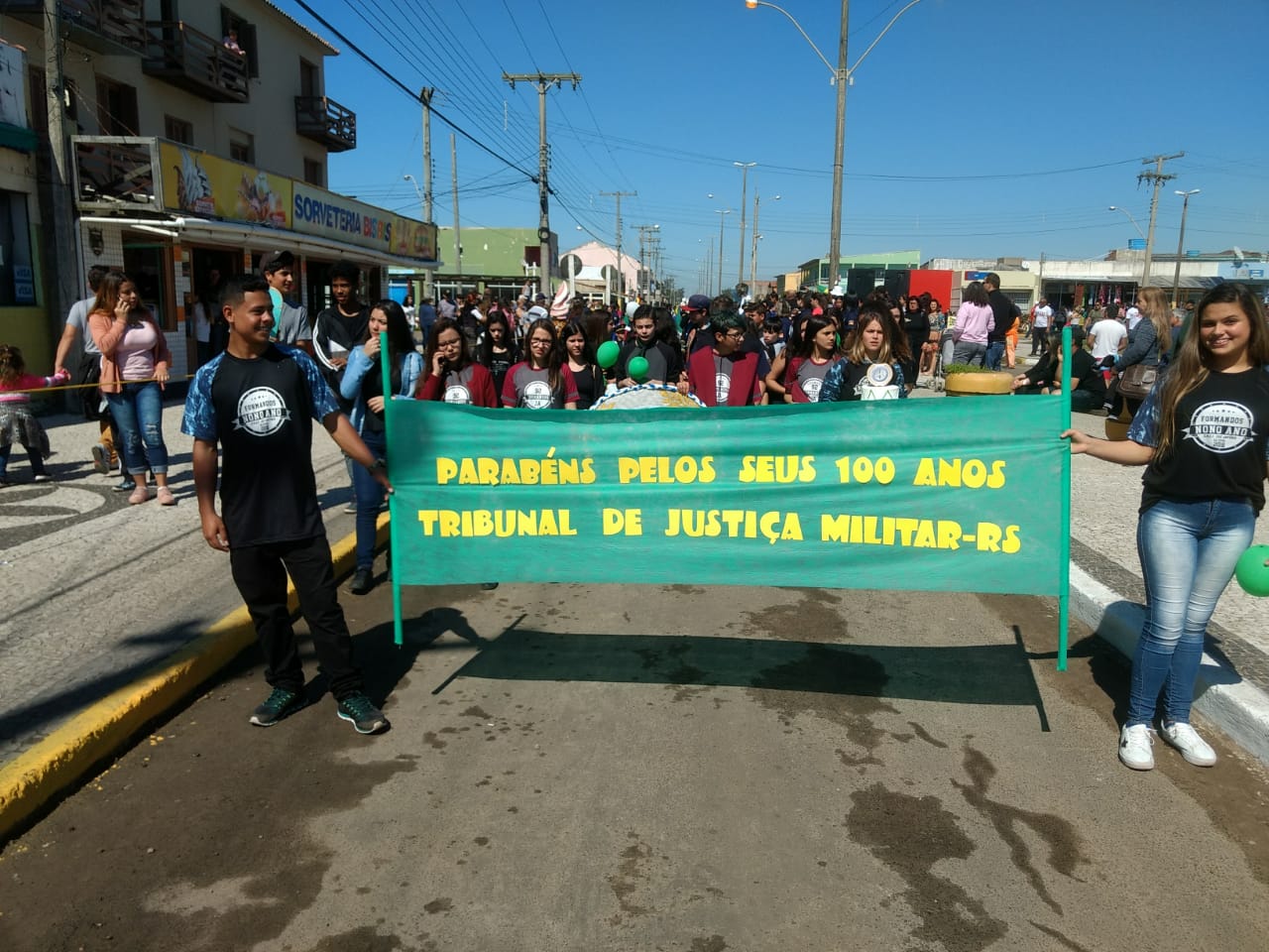 Em 08.09.18, sábado pela manhã, no centro do balneário Pinhal, a EMEF JOSÉ ANTÔNIO DA SILVEIRA desfilou com seus alunos homenageando o centenário do TJM. Os alunos portaram faixas, cartazes, o selo ouro entre outras alegorias pertinentes a nossa história.